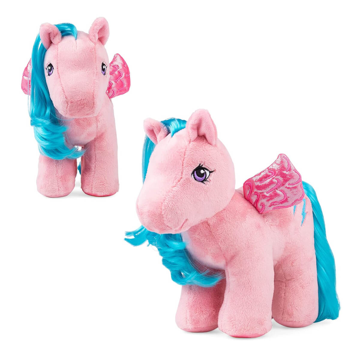 My Little Pony retro plush by Hasbro. 40th anniversary soft toy My Little Pony. Firefly comes in a beautiful pink plush material that is soft and huggable. Firefly has long, shiny blue hair that kids will love to brush, style, and braid. She has a cutie mark on her hip of firebolts.