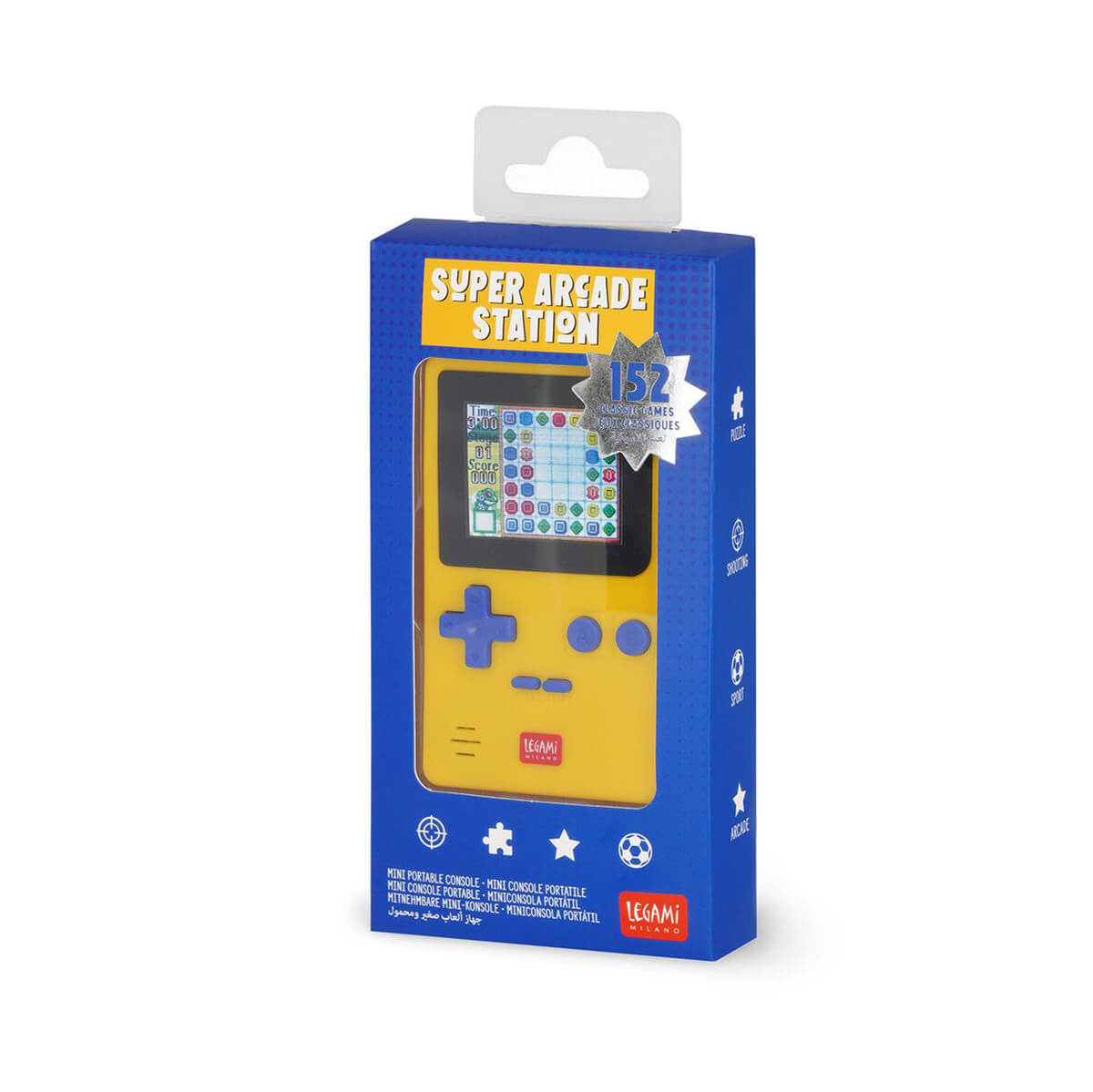Mini Portable Console Super Arcade Station by Legami. Relive the 1990s with this retro inspired portable games console. Enjoy 153 8-bit games in colour for all levels and keep it in your pocket to play wherever, whenever you need some entertainment. English language with adjustable volume.