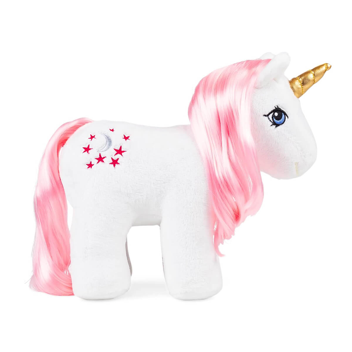 My Little Pony retro plush by Hasbro. 40th anniversary soft toy My Little Pony. Moondancer comes in a beautiful white plush material that is soft and huggable. Moondancer has long, shiny pink hair that kids will love to brush, style, and braid!