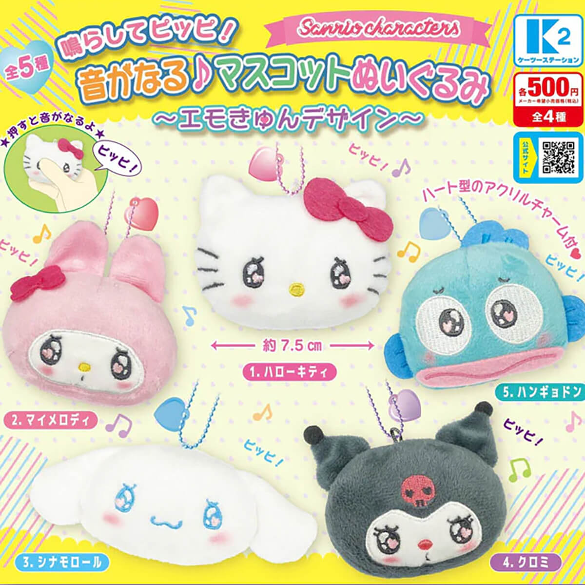 Emokyun Sanrio Characters Sound Mascot Gachapon Capsule Collectible by K2 Station. Highly collectible and authentic Japanese gachapon capsule containing one of five different Sanrio characters that make a squeaky sound when squeezed. These mini plush mascots are irresistibly soft and totally emokyun - where emo is short for emotional and kyun means to be choked up with powerful feelings usually from cuteness! Each character is made from a soft plush material with embroidered features and comes with a ball chain with a little heart charm, to attach it to your bag or keys.