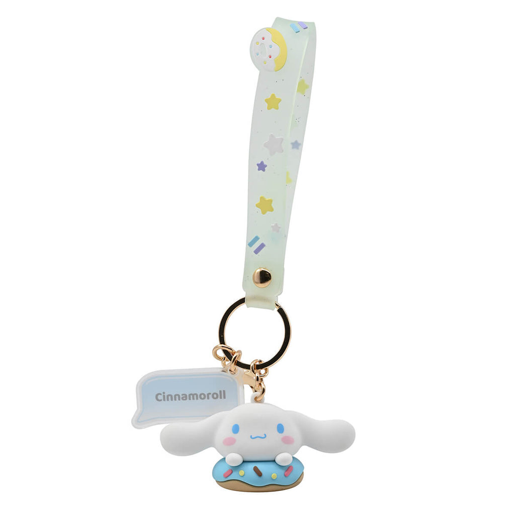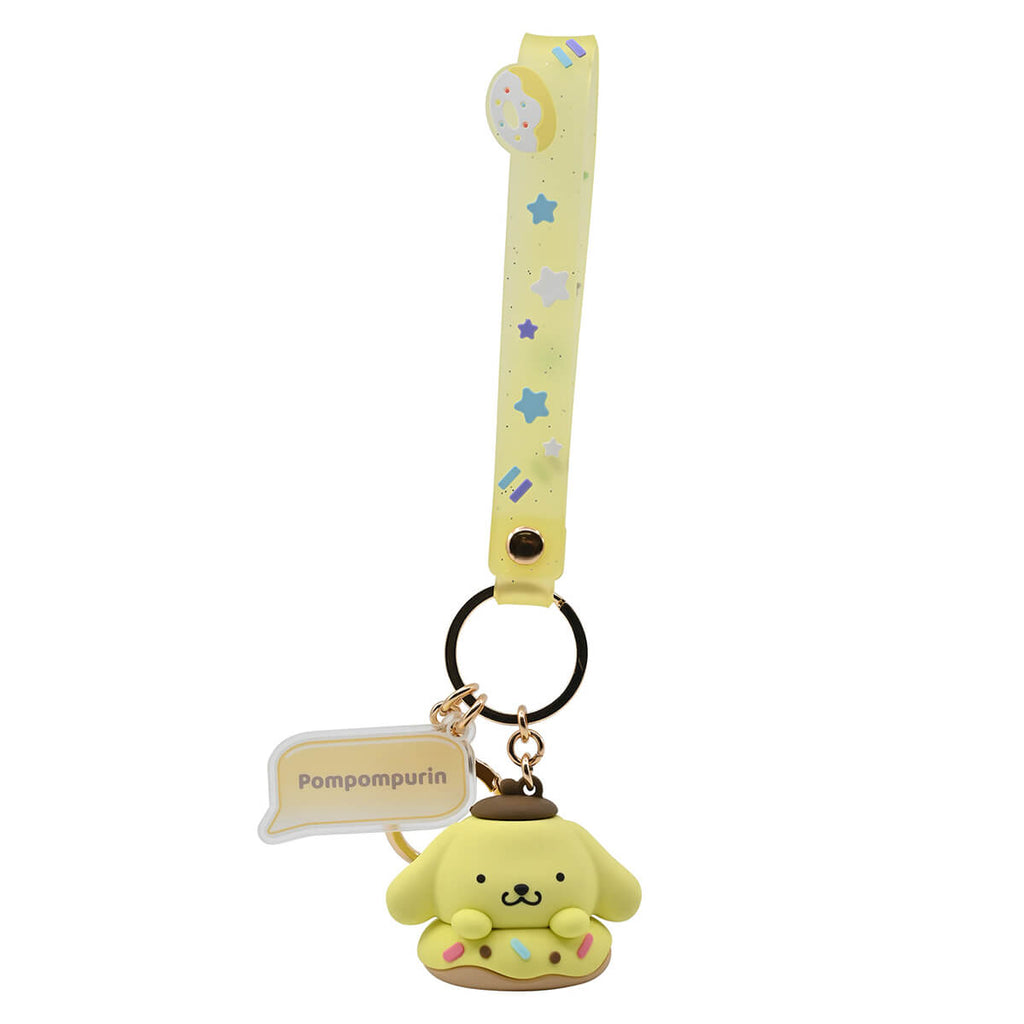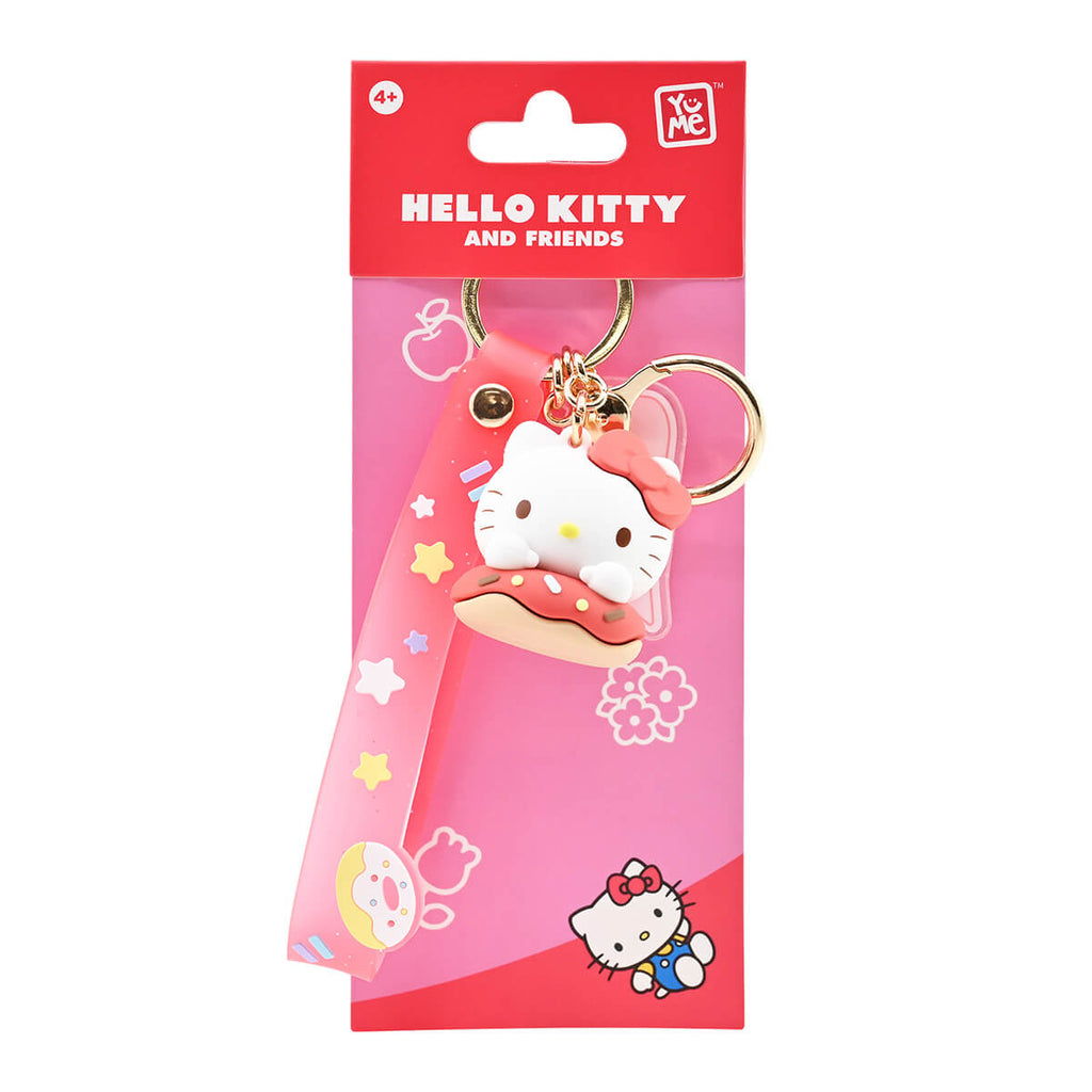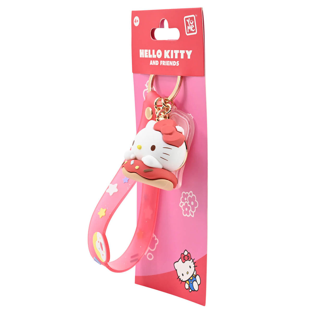 Hello Kitty character keyring Donut series by Yume. Sweet Sanrio character charm keyrings to clip onto your bag. Metal keyring with wrist strap, Sanrio character and charm, with an extra quick-release clip to fasten the keyring onto your bag, purse or pencil case. This series features your favourite Sanrio characters with donuts.