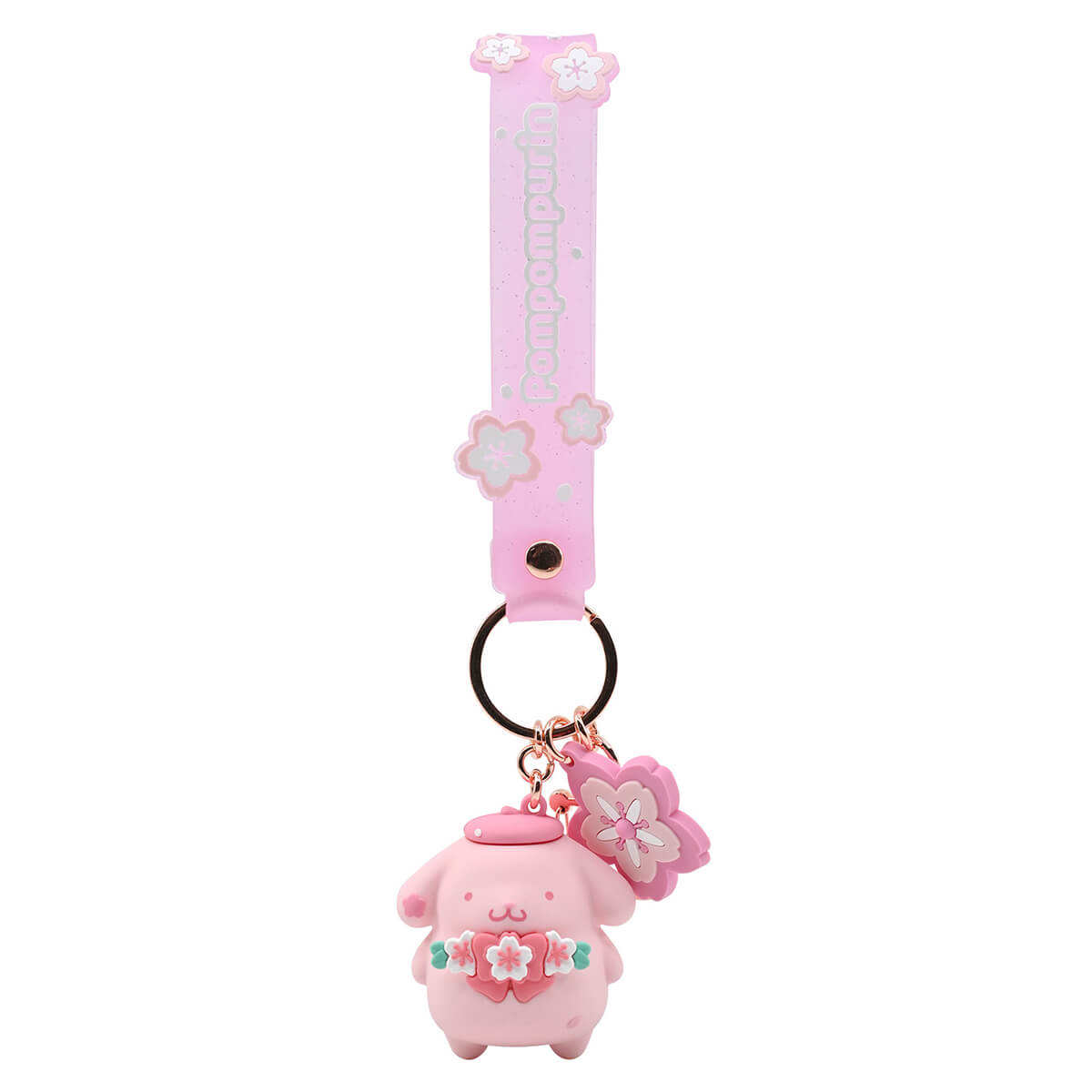 Hello Kitty character keyring Sakura series by Yume. Sweet Sanrio character charm keyrings to clip onto your bag. Metal keyring with wrist strap, Sanrio character and charm, with an extra quick-release clip to fasten the keyring onto your bag, purse or pencil case. This series features your favourite Sanrio characters in cherry blossom pink with sakura flowers.