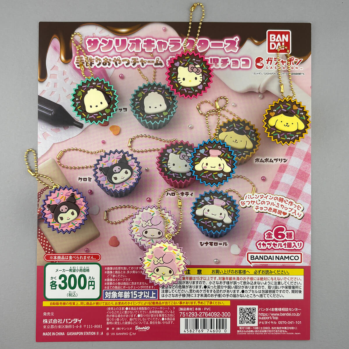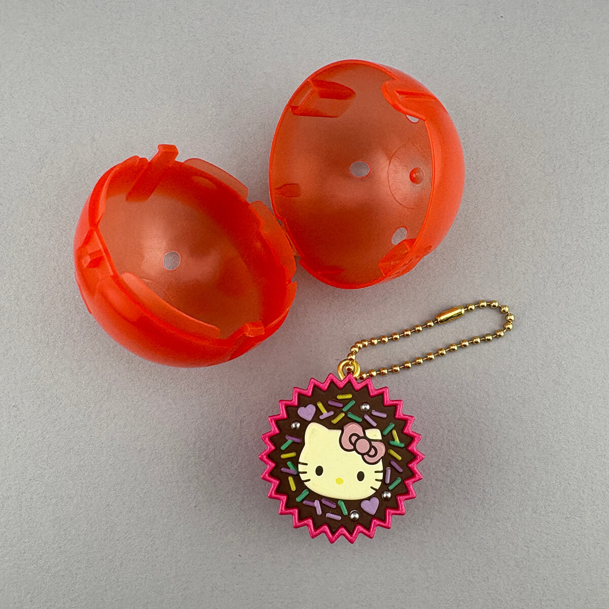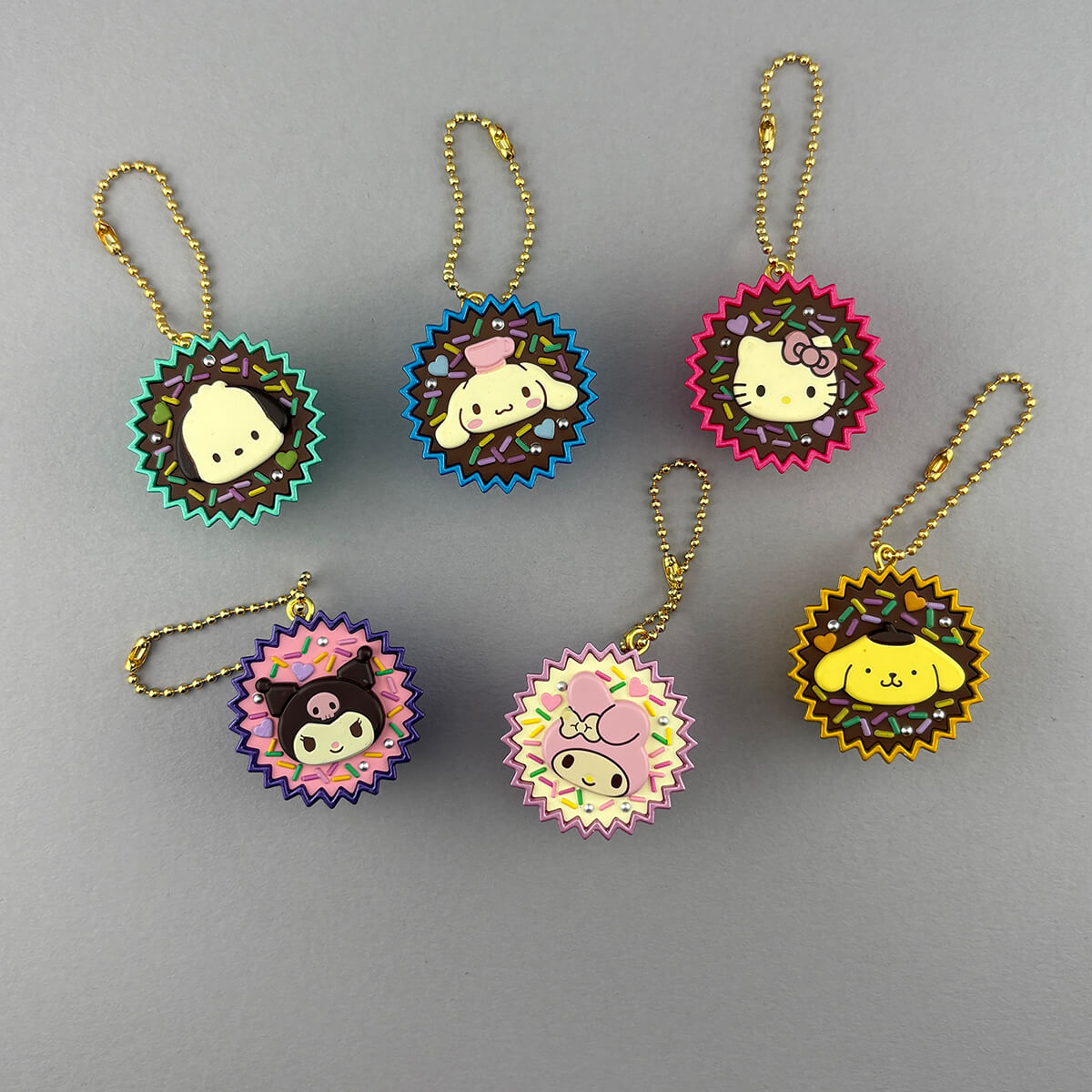 Sanrio Characters Heisei Girl Handmade Chocolate Charm Gachapon Capsule Collectible by Bandai. Highly collectible and authentic Japanese gachapon capsule containing one of six keychains shaped like a Heisei Girl 90s handmade chocolate in an aluminium cup decorated with a Sanrio character and sprinkles. On a gold tone ballchain to attach to your bag, keys and more.