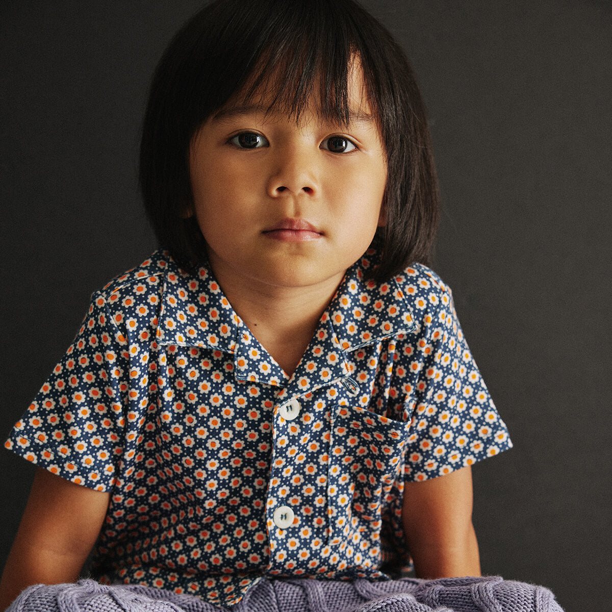 Sonny Top by Misha & Puff. A short sleeve button-up top in pima cotton, with a point collar, patch pocket, corozo button closure, and contrast topstitch detail. The perfect piece to grow with, plus a collar for layering. Featuring this season’s graphic print.