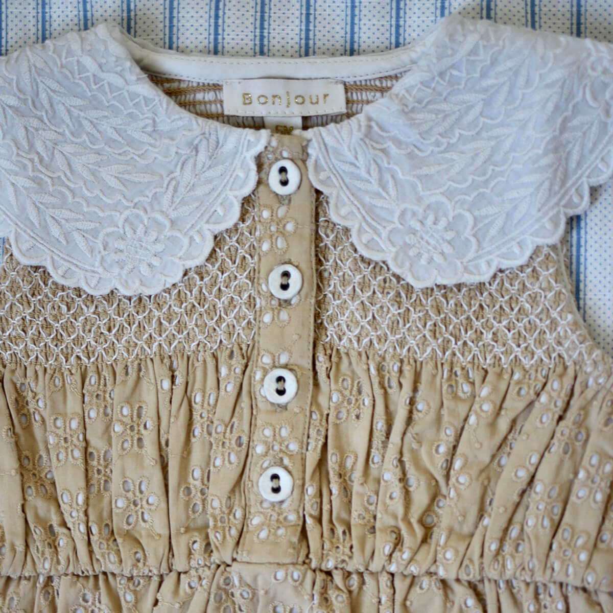 Baby Romper in Honey by Bonjour. A collared baby romper in broderie anglaise with front buttons and elasticated leg. Featuring Bonjour's signature elastic smocking. From baby up to age 6.
