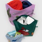 Go Pouch Set by Baggu. The Go Pouch Set makes it easy to keep your bag neatly packed and organised. Whatever you're toting—coins, cords, or an extra pair of shoes—this set of three all purpose pouches keeps it together. They expand to hold your essentials and lay flat when not in use.