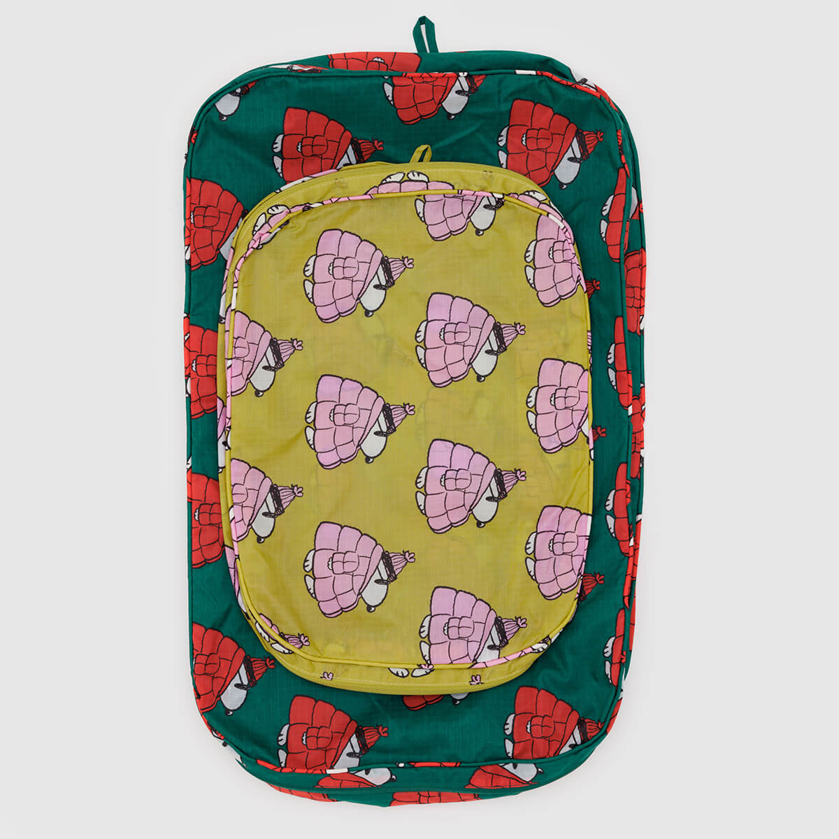 Large Packing Cube Set by Baggu. Larger sized travel-ready packing cubes to wrangle the biggest items on your packing list. Perfect for packing, organising your bag, or home tidying. Zip closure. Fits perfectly inside the Baggu Travel Cloud Bag or Cloud Carry On. Designed to fit bulkier items. Large pouch fits two pairs of sweats plus two hooded sweatshirts.