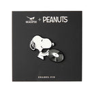 Record Snoopy Pin by by Magpie. Black nickel plated brass pin with coloured enamel. Pin is approx 30mm high. Comes with backing card packaging.