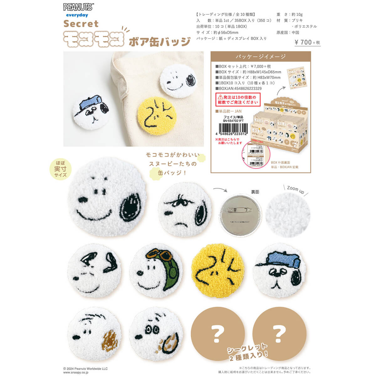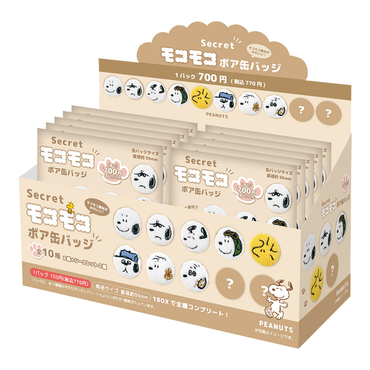Snoopy Secret Fluffy Mocomoco Boa Tin Badge blind bag by T's Factory Japan. Direct from Japan, this blind bag from T's Factory contains one of ten different Mocomoco fluffy badges featuring your favourite Peanuts Snoopy characters in fluffy boucle fabric with embroidered details.