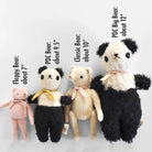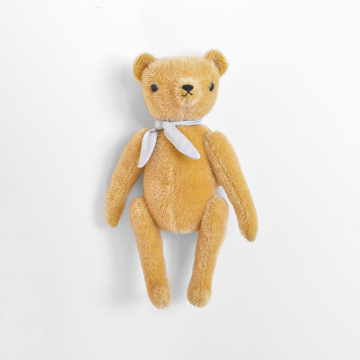 Made with love from 100% natural materials.  Mohair fur is woven onto a cotton backing.  Features a hand embroidered nose and fully disk jointed head, arms, and legs, safety eyes and cotton neck tie.