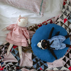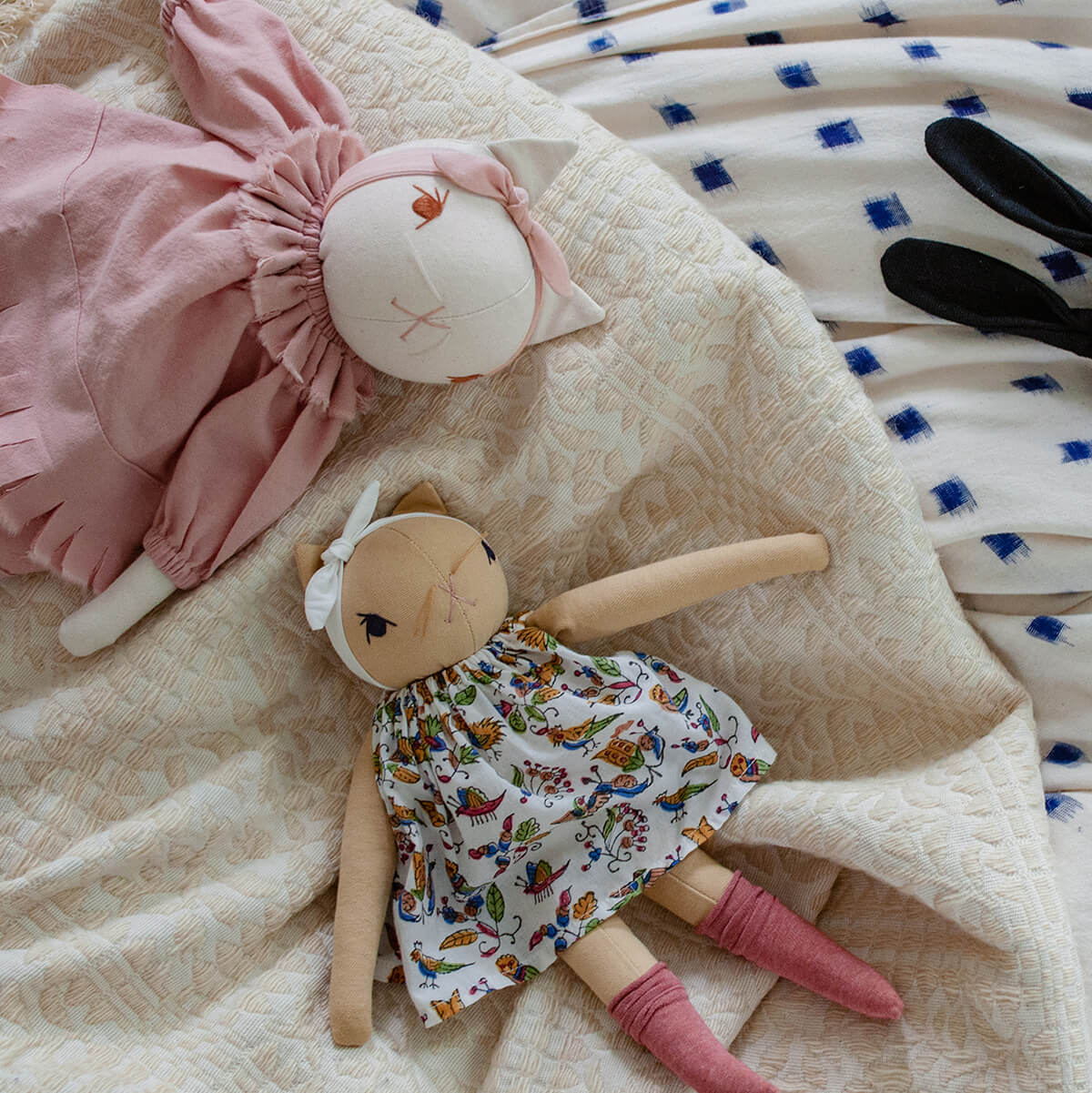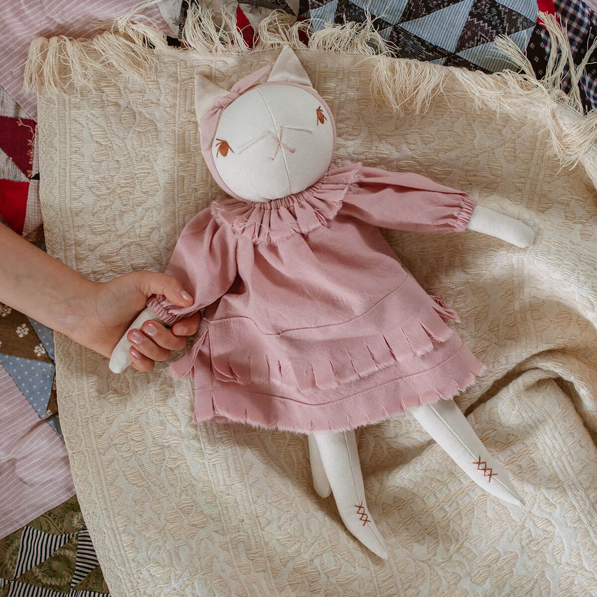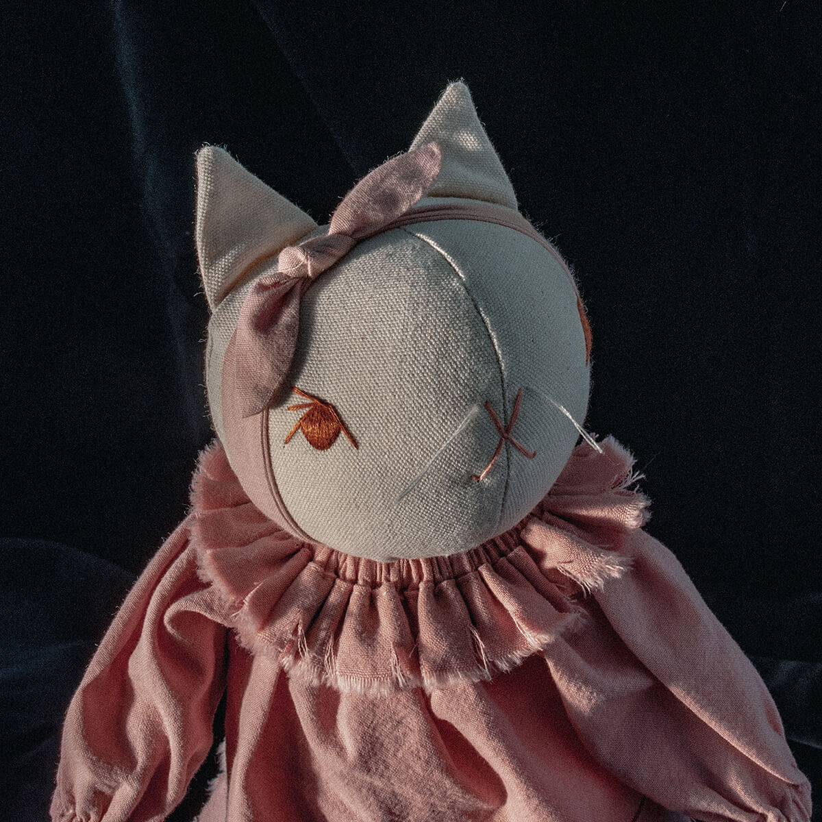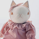 Lottie large cat by Polka Dot Club. Imogen is made from 100% cotton canvas with a hand-embroidered face. She has a disc-jointed neck and floppy limbs. She is wearing a muted pink cotton dress and a cotton headband.