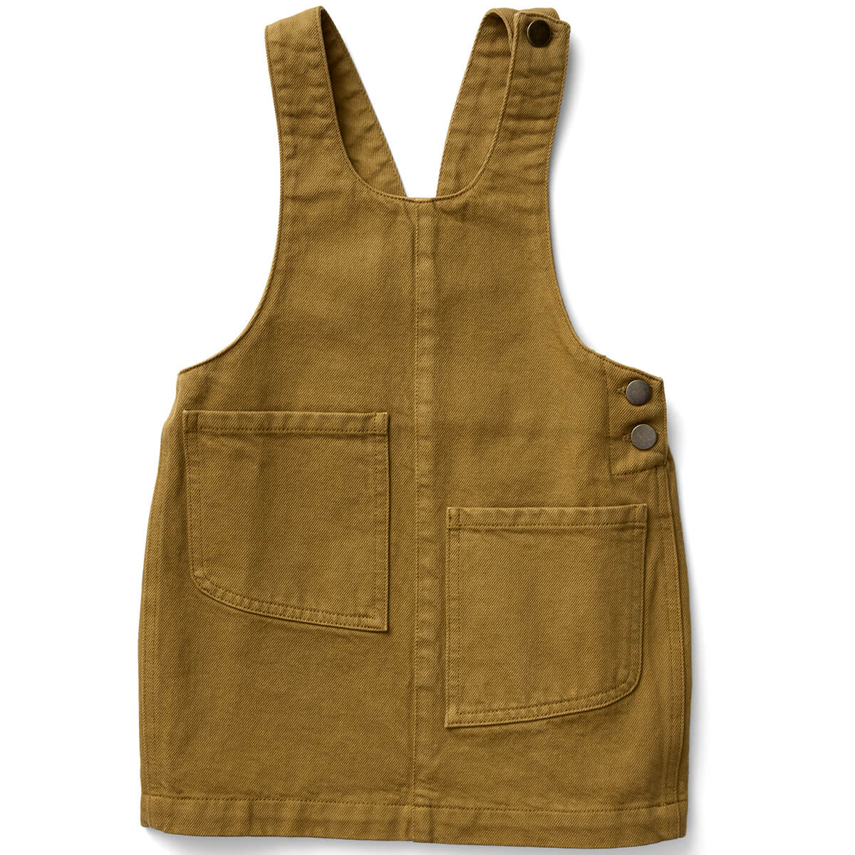 Delilah Pinafore by Soor Ploom. Overall shift dress with antique brass shank closure at wearer's left shoulder and side. Asymetrical patch pockets. Falls to mid thigh.
