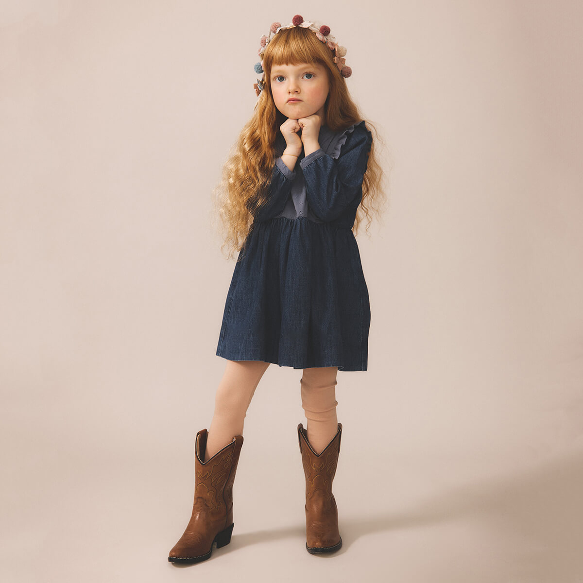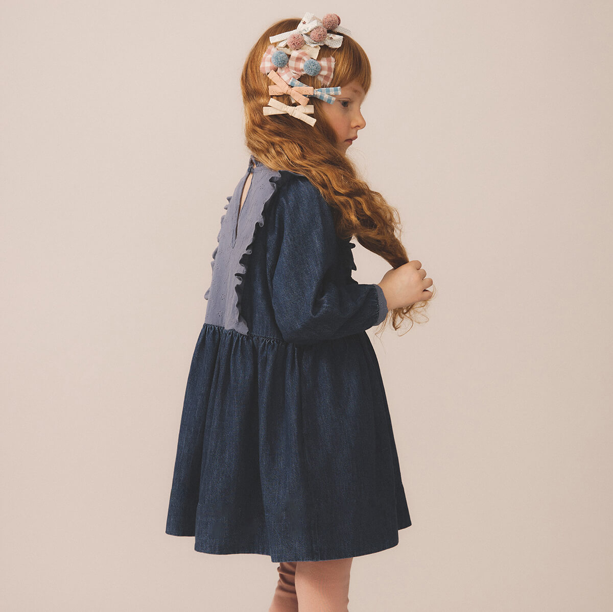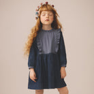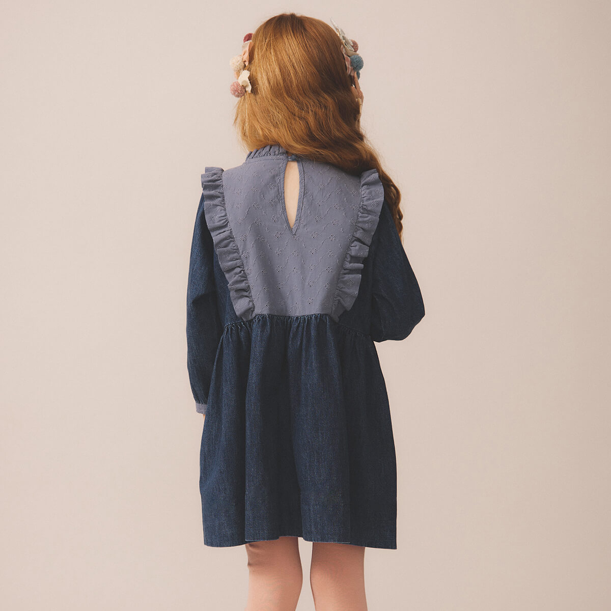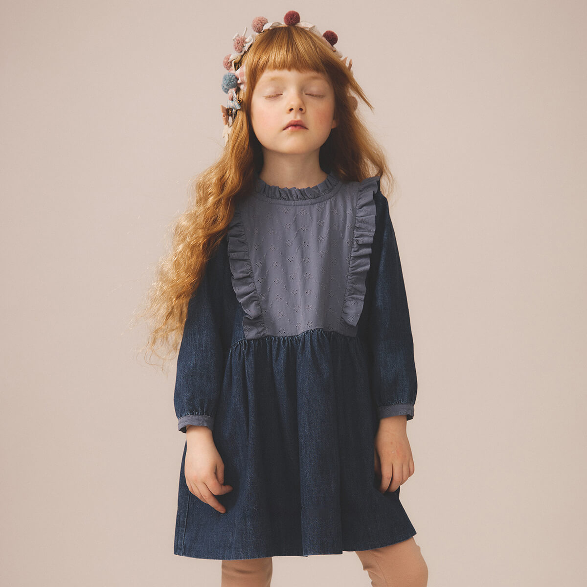 Percy Dress by Soor Ploom. Baby doll dress with long sleeves and bibbed yoke in eyelet. A generous silhouette with a covered button at the back neck. Falls above knee.