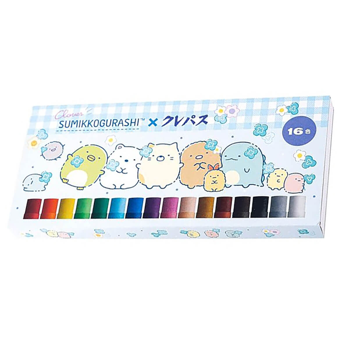 Sumikko Gurashi Cray-pas Crayons by San-X. Set of 16 oil based wax crayons in a cardboard box featuring all your favourite Sumikko Gurashi Friends. They produce bright colours which can be easily blended, layered and overlaid.
