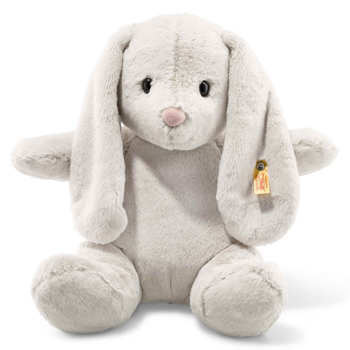 Hoppie rabbit by Steiff. Big and super cuddly Steiff bunny measuring 38cm tall. She is soft and cuddly with light grey fur, a cute pink nose and super long ears. The bean bags included at her seat, paws and soles ensure good support and are ideal for gripping and feeling. The soft and dense cuddly toy in tender light grey lends itself to snuggling and caressing. Hoppie is machine washable at 30°C and makes a great little gift for a loved one.