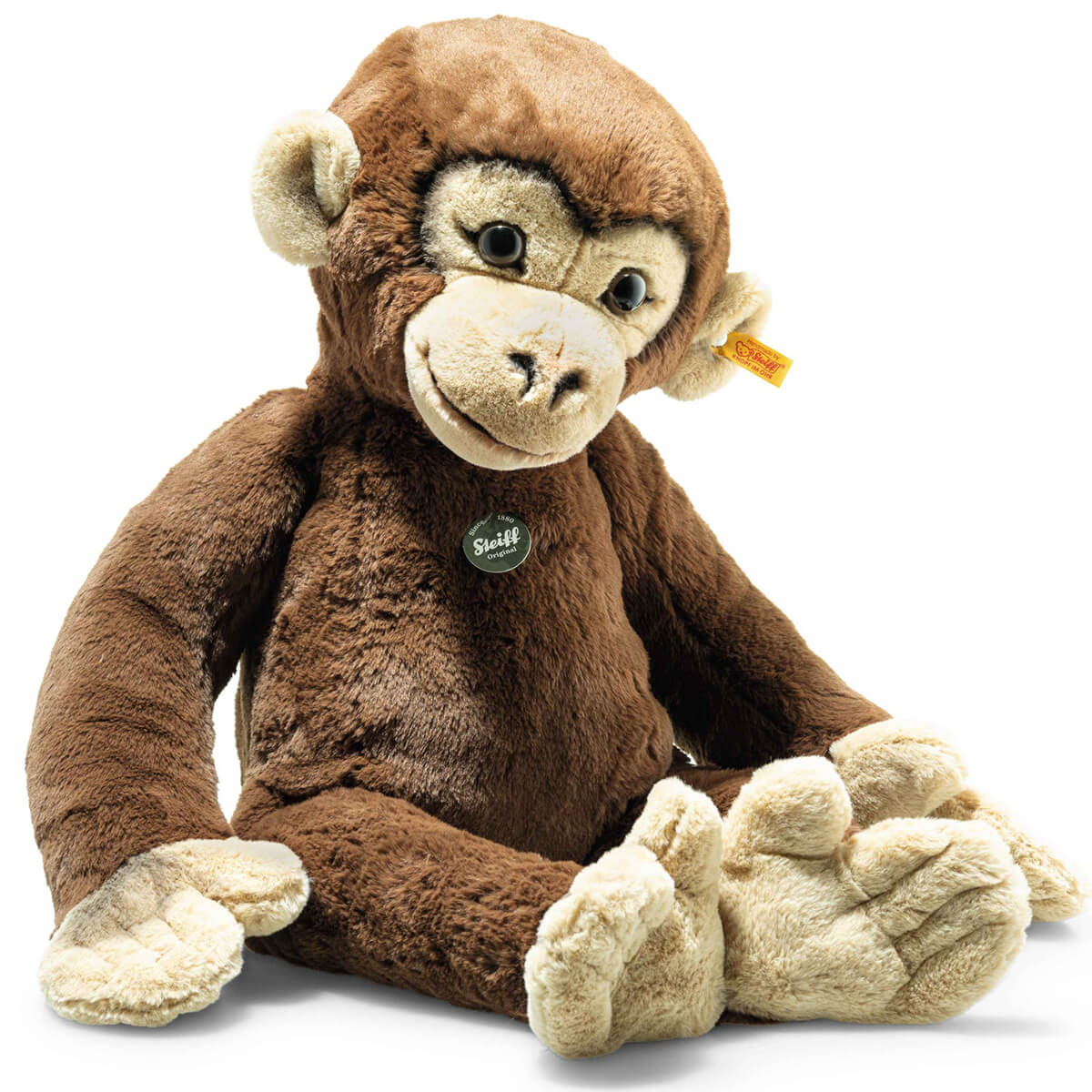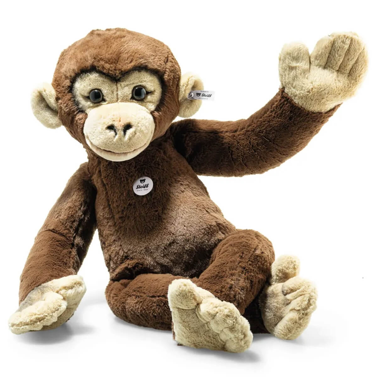 Jocko Chimpanzee by Steiff. Measuring 70 cm tall, Jocko chimpanzee is made of recycled PET plush and his filling is also made of recycled PET. Jocko loves to fool around and is in his element when he's playing, clambering around or having a cuddle. His cheerful face is lit up by his cheeky smile and his mischievous eyes appear to sparkle with a thirst for adventure. Let the adventures begin!