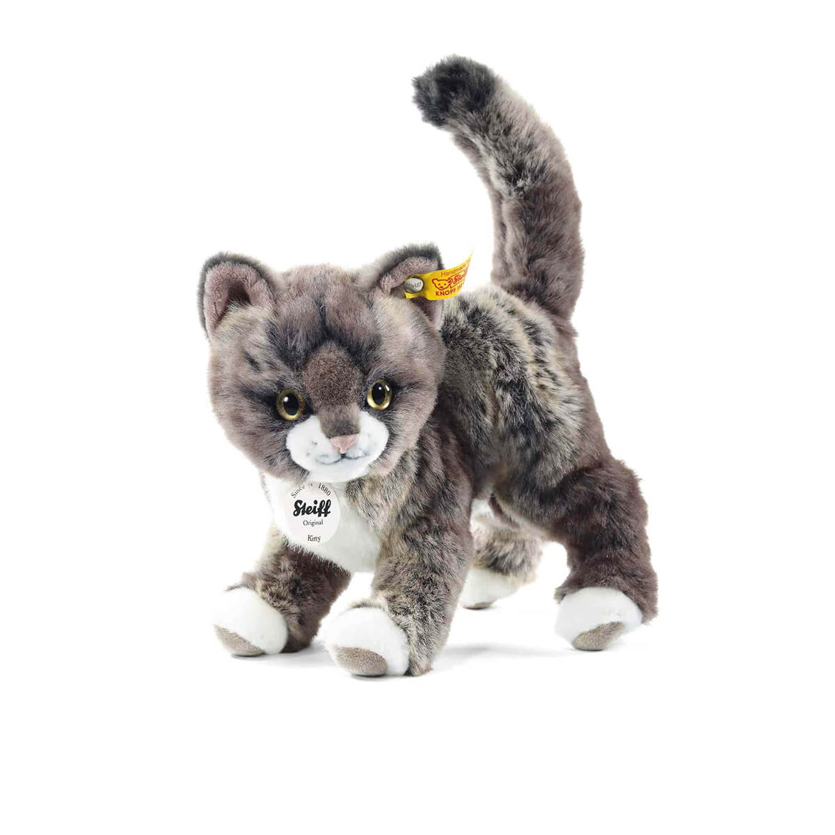 Kitty Cat by Steiff. Measuring 25cm tall, Kitty cat is very playful and cuddly, and made of cuddly soft woven fur. She has the Steiff stainless steel "Button in Ear".