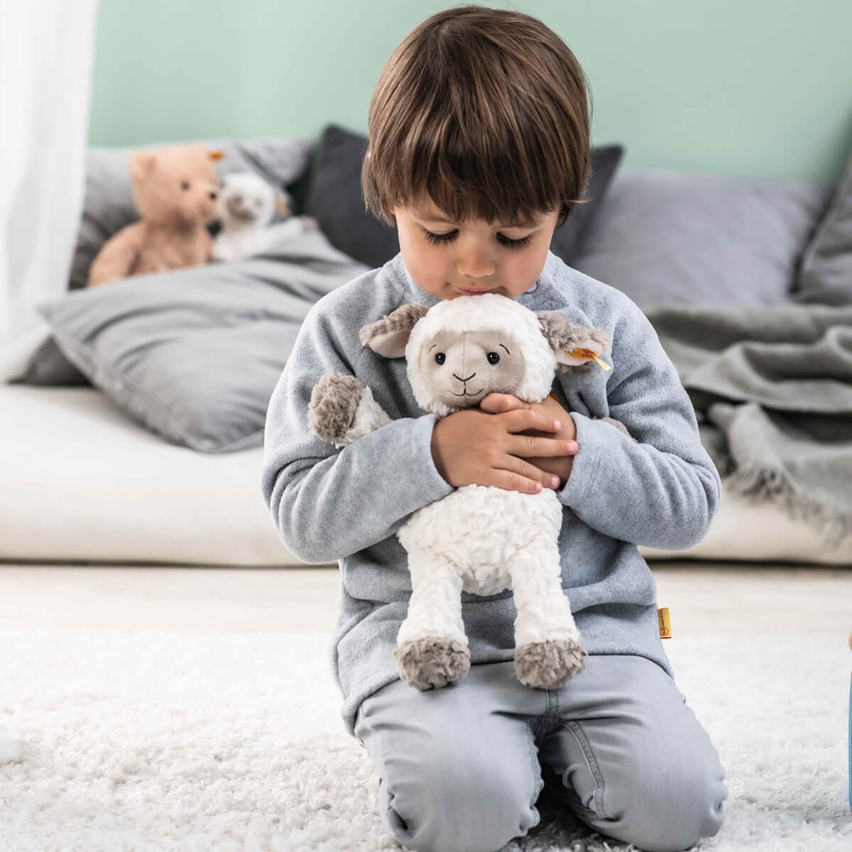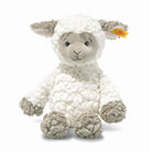Lita Lamb by Steiff. The 30cm tall Lita lamb is so cute with its slightly structured plush pelt. Its soft pink ears and its brown/grey paws are in stark contrast to its white body. Its nose, mouth and eyebrows give Lita lamb a truly sweet appearance. The bean bags sewn into its bottom and hooves ensure good support and are ideal for gripping and feeling. He has a Steiff tag and stainless steel "Button in Ear".