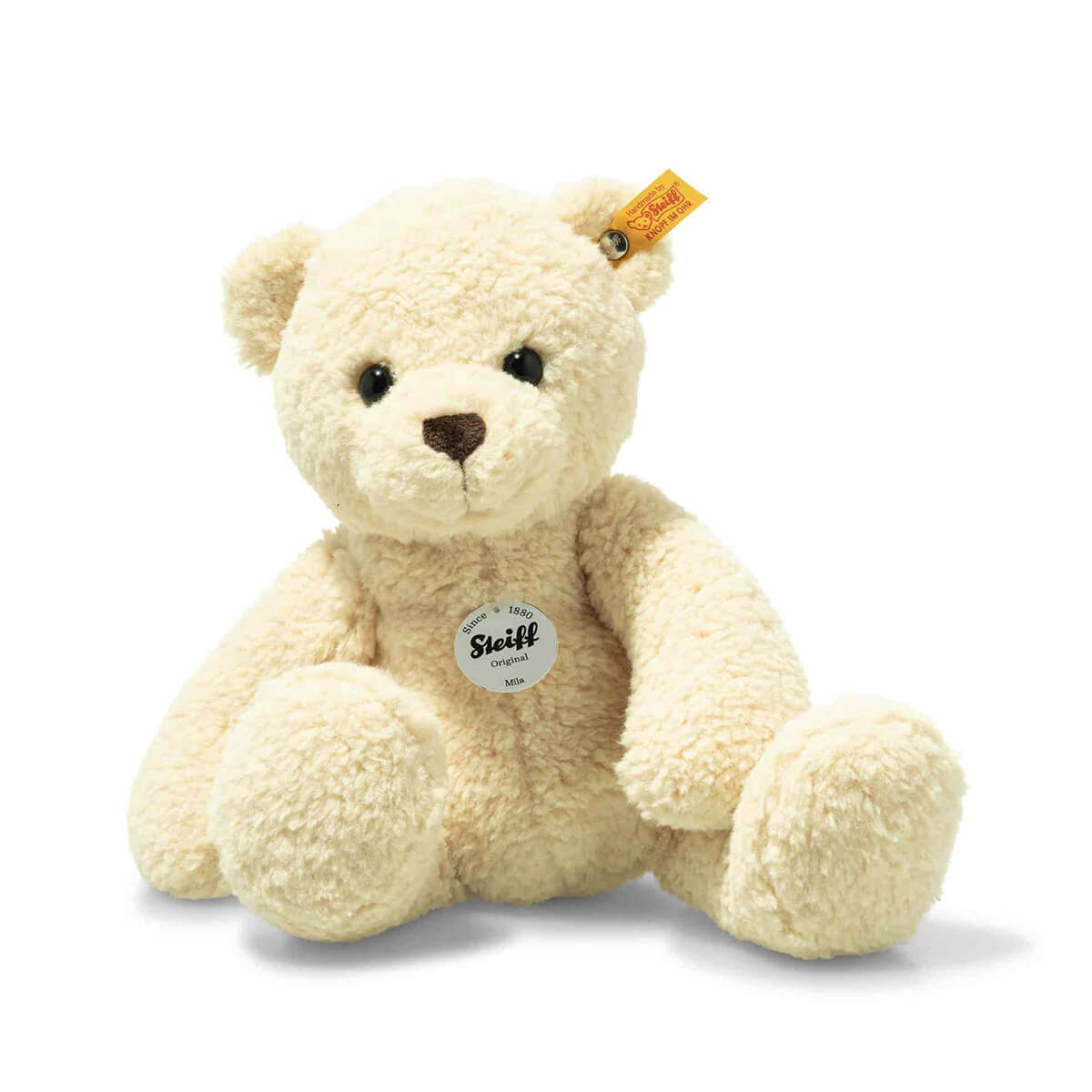 Mila Teddy Bear by Steiff. Mila teddy bear is a non-jointed teddy bear made of super soft, cuddly vanilla yellow teddy fleece. She comes with characteristic centre seams, a cuddly body and large paws, as well as characteristic teddy bear ears, a brown nose and the Steiff classic stainless steel "Button in Ear".