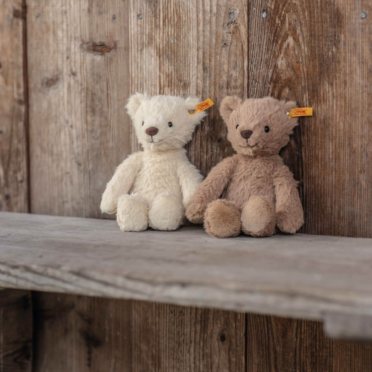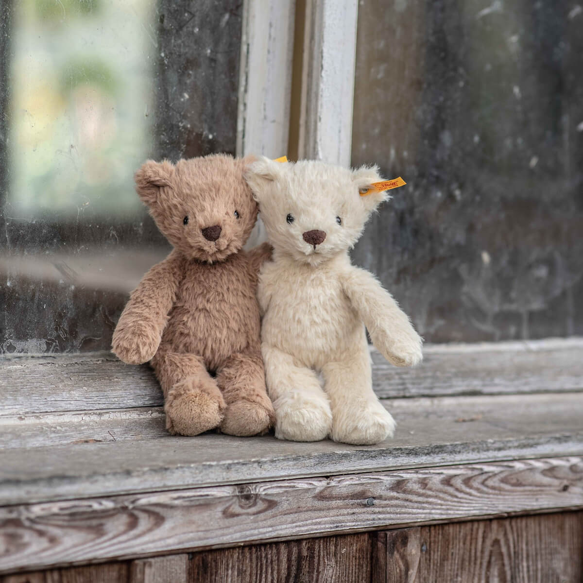 Thommy Teddy Bear by Steiff. Thommy Teddy bear is 20cm tall and made of cuddly soft, caramel-coloured plush. His soles and paws are contrasted in short plush. Tommy has a beautifully shaped teddy bear head with bright black eyes, a cute dark brown nose, an embroidered mouth and cuddly teddy bear ears with a Steiff tag and stainless steel "Button in Ear". Little bean bags in his bottom, paws and soles make playtime even more fun and allow him to sit steadily.