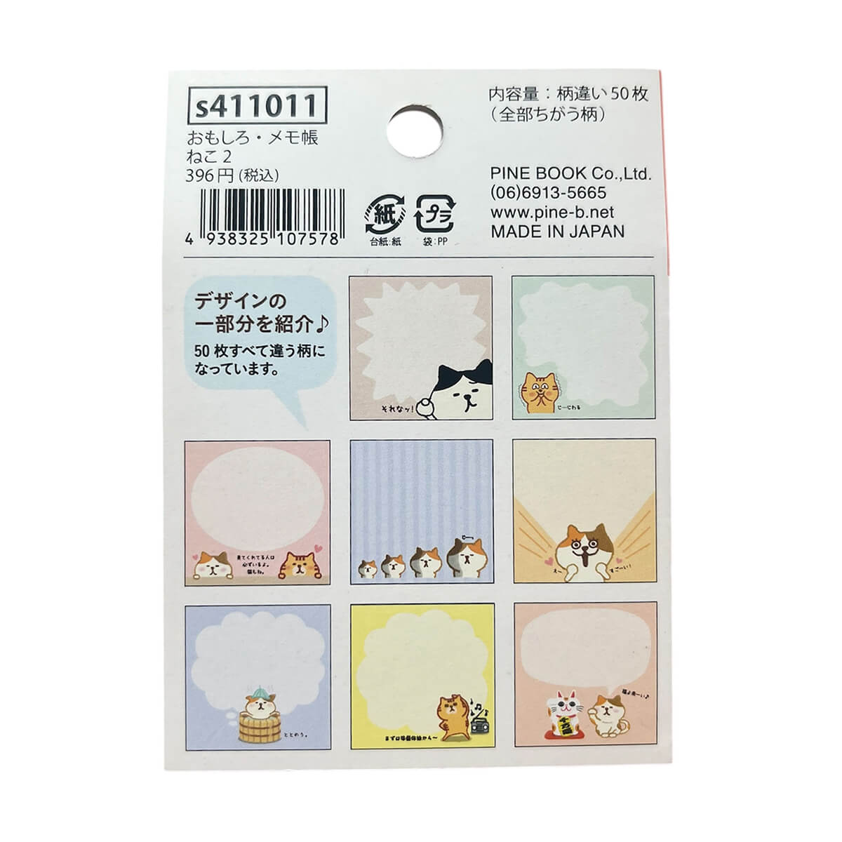 Cat Memo Pad by Pine Book Japan. Little note pad featuring 50 patterned note sheets in different designs. Full of amusing characters that will make you chuckle. Each one has a different design, so you can enjoy simply flipping through them.