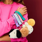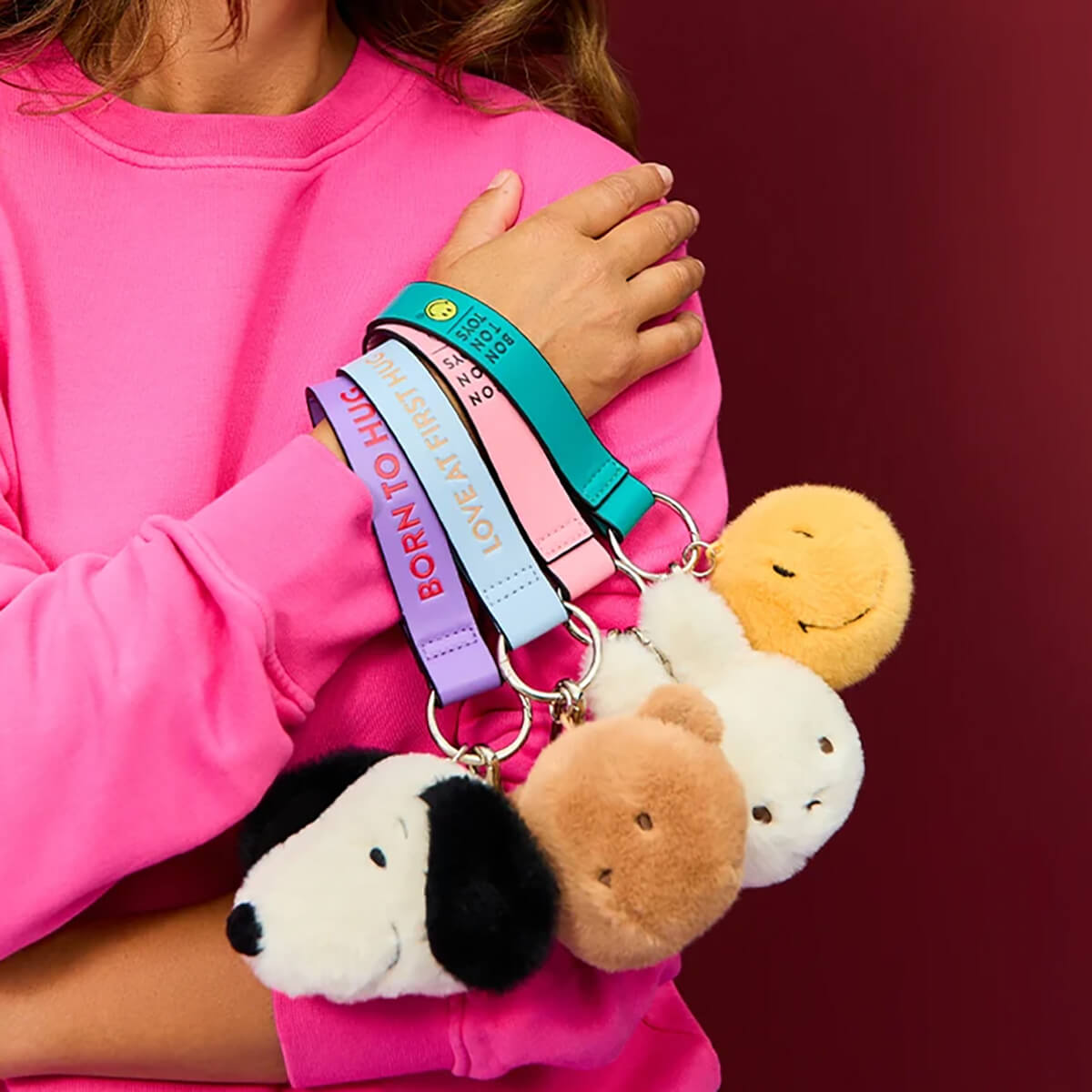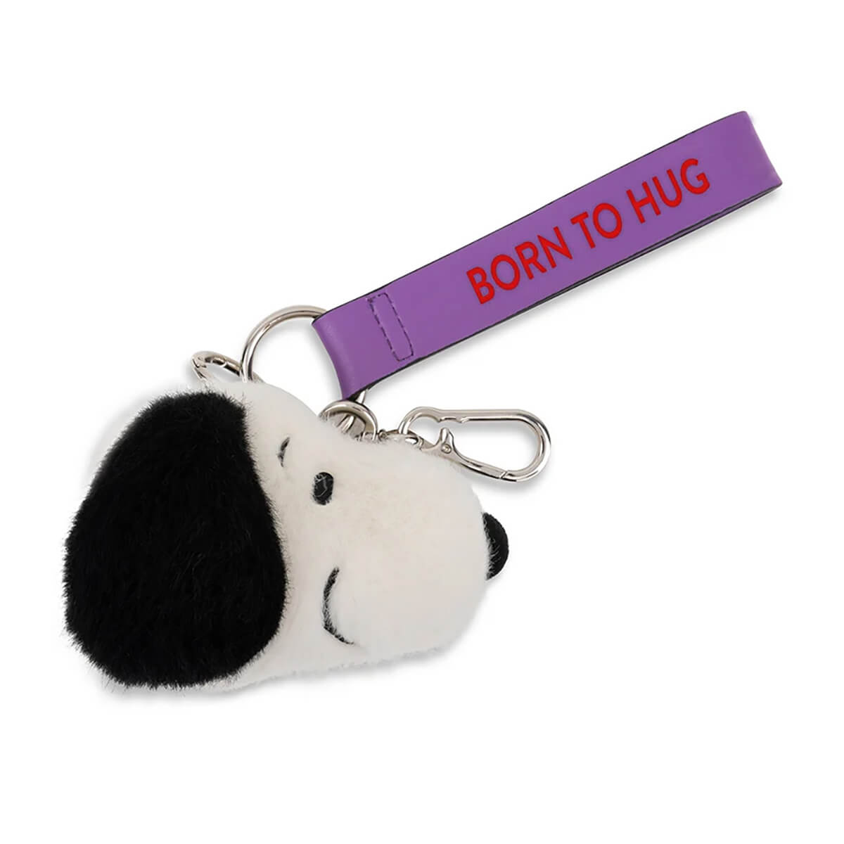 Snoopy Fuzzy Bag Charm by Bon Ton Toys. The Snoopy ECO Fuzzy Bag Charm is part of the exciting Bon Ton Toys x Peanuts collection featuring the iconic Snoopy and Woodstock from Charles M. Schulz's world-famous Peanuts comic strip. The adorable plush has the softest fuzzy fur and is shaped like Snoopy's cute little head, easily recognisable for any Peanuts fan, adding a playful touch of nostalgia to your bag. The keychain also features a purple vegan leather tag with "Born to Hug" text, adding to the large, exaggerated bag charm look, making it a great accessory for those wanting to make a playful statement.