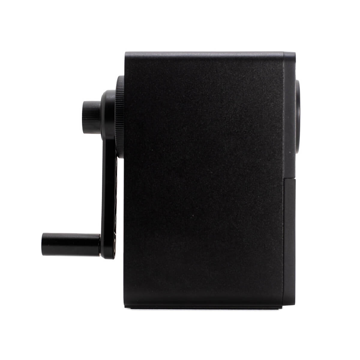 Blackwing desktop pencil sharpener by Blackwing. The Blackwing Desktop Sharpener uses a helix blade to sharpen your pencils to perfection without marking the pencil's premium finish with 'bite' marks and is a must for any Blackwing enthusiast! The dial on the crank allows you to adjust the point from long and curved to short and blunt. A point adjustment dial on the hand crank give you 5 different settings so you can adjust your point for all of your creative needs. Its unique sharpening system retracts the pencil automatically without scuffing the finish, and it includes an automatic brake to prevent over-sharpening. The sharpener is cased in a durable matte black metal and polymer shell that looks sleek and feels substantial. It also features a drawer to empty the shavings that locks into place with a satisfying *click*.