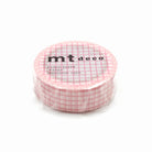 Hougan Sakura Grid 15mm Deco Series washi tape by MT Japan. This decorative roll from the MT Deco Series features a sakura pink grid print on a white background. From the mt DECO series, which showcases a variety of patterns including polka-dots, stripes, borders and grid paper.
