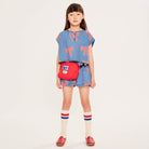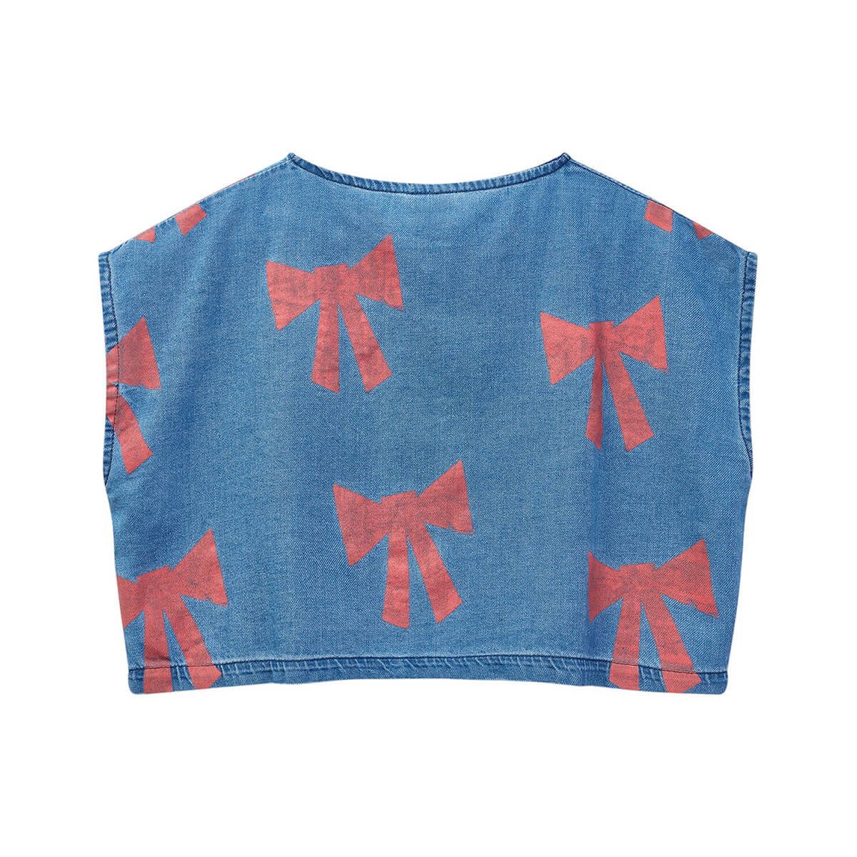 Vela Top by Wynken. This super-cool, sleeveless Vela Top is made from soft twill denim, perfect for carefree play and big adventures. With its fun, oversized bow print in a bold red and a sweet pop of blue Wynk embroidery, it’s all about fun vibes and standout style. The easy henley snap popper neckline makes dressing a breeze, and the relaxed fit means endless comfort all day long. Designed with care, it’s ready for twirls, skips, and smiles.