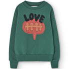 Bear Kid Sweatshirt by The Animals Observatory. The bold LOVE message and figures feature on deep green.
