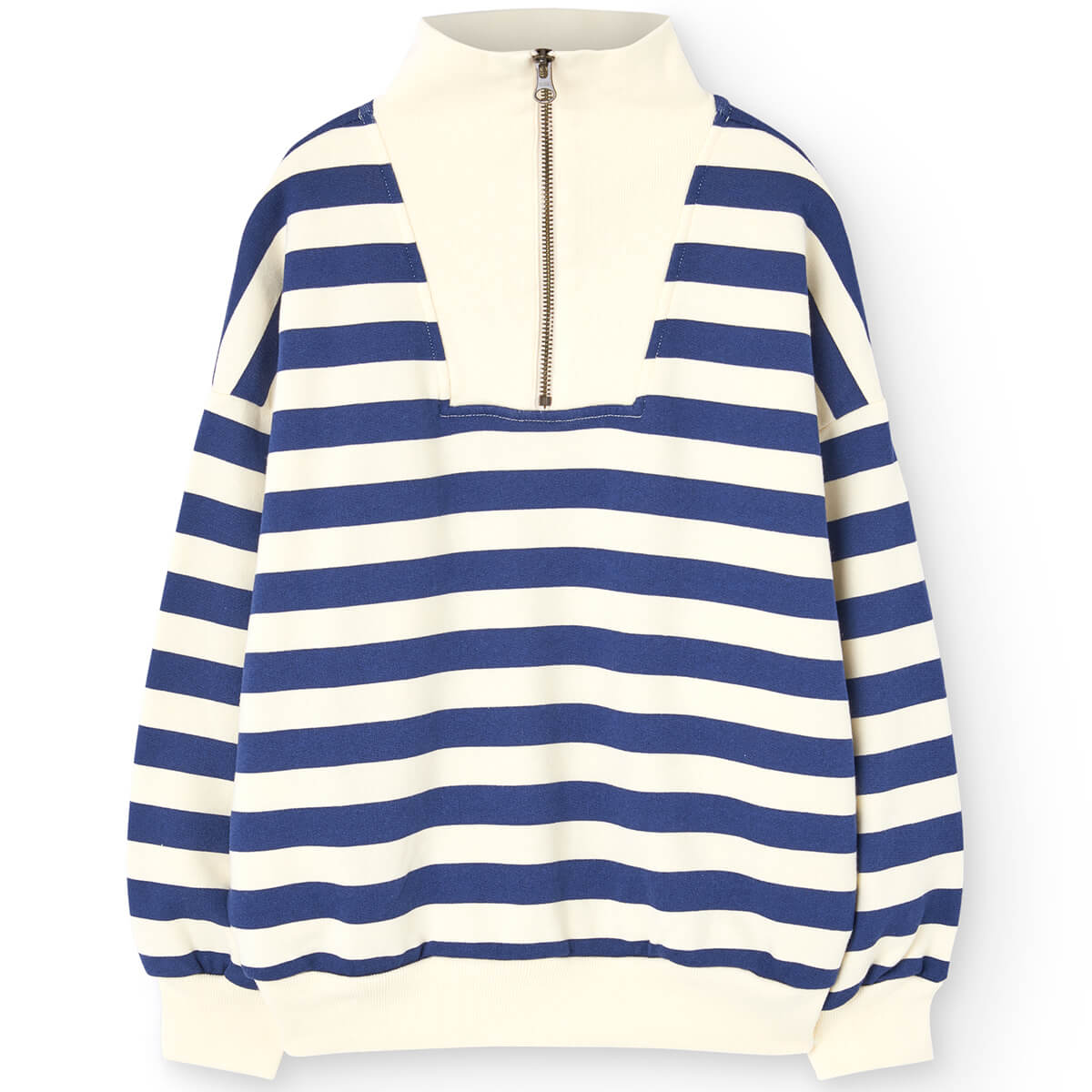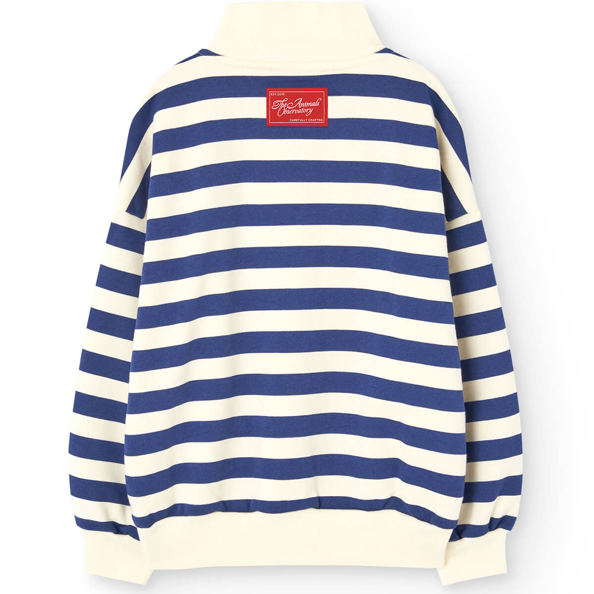 Blowfly Kid Sweatshirt by The Animals Observatory. This half-zip striped sweatshirt balances classic navy tones with a modern zip-up front and logo patch.