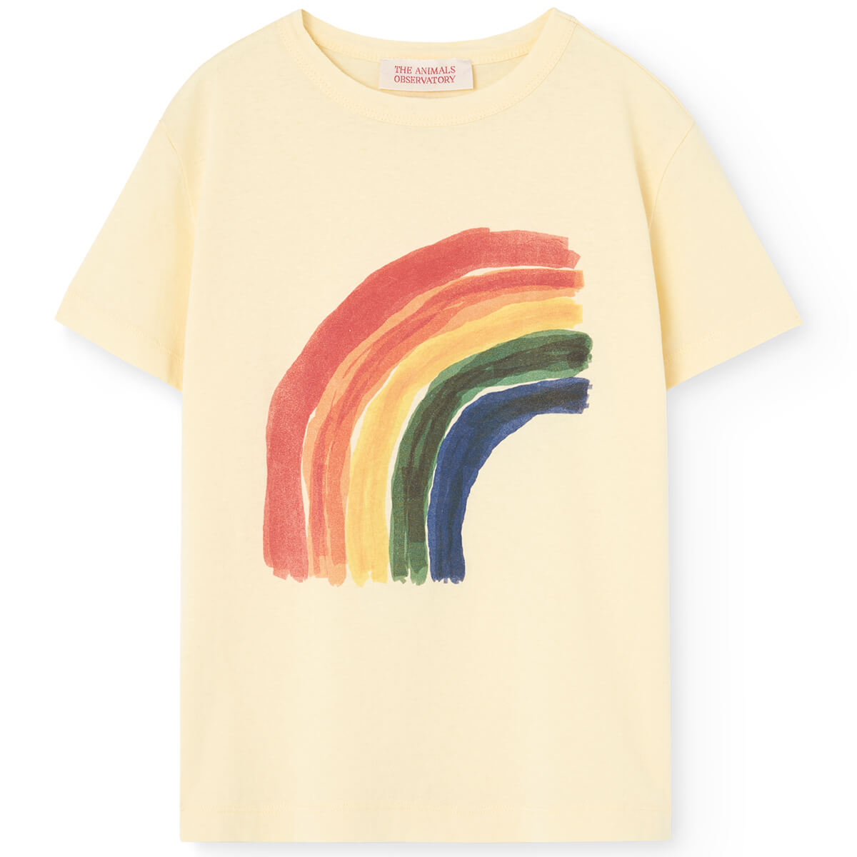 Rooster Kid T Shirt by The Animals Observatory. This joyful tee features a bold hand-painted rainbow on the front and a subtle logo detail on the back