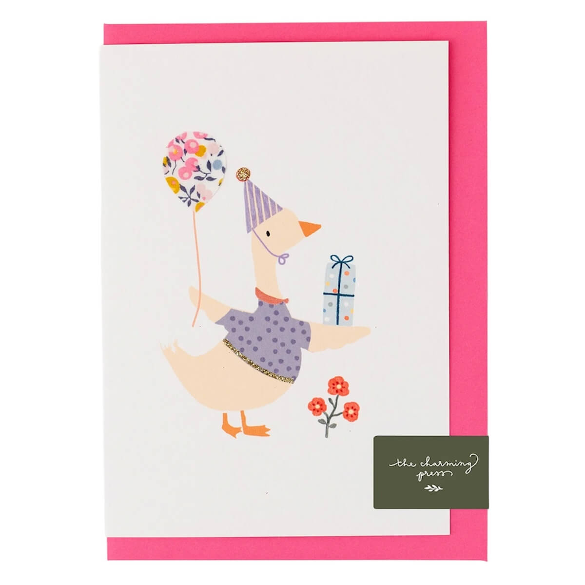 Liberty Goose Birthday Greetings Card in Wiltshire Bud Liberty Print by The Charming Press. A charming little goose carrying a Wiltshire Bud balloon. Hand finished with golden biodegradable glitter detail.