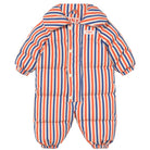 Stripes Padded Overall by Tinycottons. This super warm stripes padded pram suit is made from 100% cotton with an ECO WDR (Durable Water Repellent) finish and a protective coating offering water resistance of 500-800pa. Featuring a full zip closure and an additional snap front placket, it provides extra warmth and protection. Perfect for everyday wear, this overall combines comfort and practical style for cooler days.