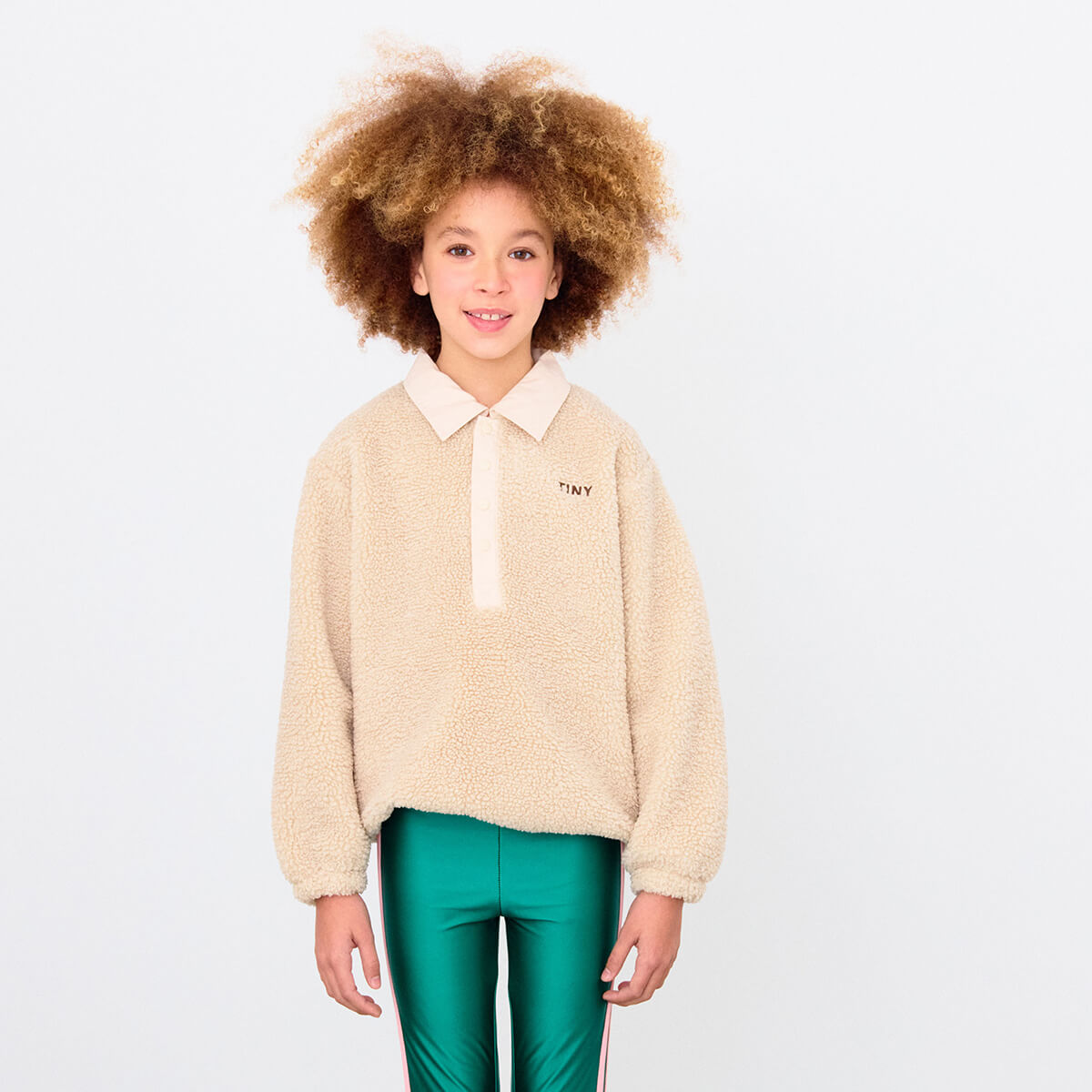 Sherpa Collar Sweatshirt by Tinycottons. This polar sherpa sweatshirt is crafted to keep you cosy in cold weather. It features a comfortable silhouette with elasticated hems, a woven polo neck, and a half-front snap opening for easy wear. Whether it’s a casual outing or a relaxed day at home, it delivers both style and comfort with a strong focus on quality.