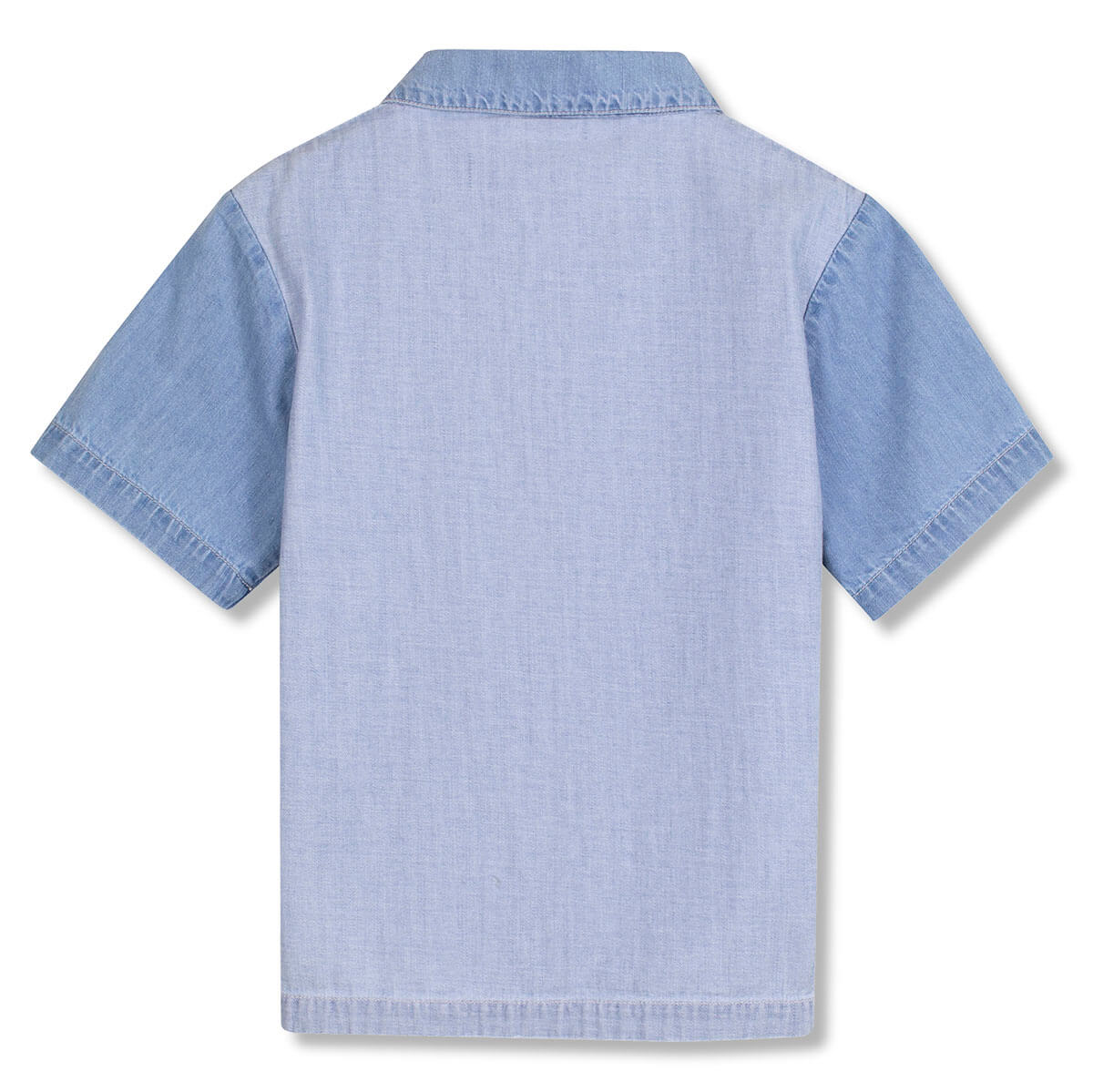 Short Sleeve Panel Shirt by Wynken. This denim Wynken shirt is made from lightweight denim, keeping things cool while giving that classic look. The front chest pocket adds a practical touch for small treasures, with black printed Wynken branding just beneath it for a subtle, stylish detail. The back panel is made from a lighter-toned denim, creating a playful visual contrast that makes the shirt feel fresh and unique. The slightly boxy fit allows plenty of room to move, stretch and play.