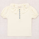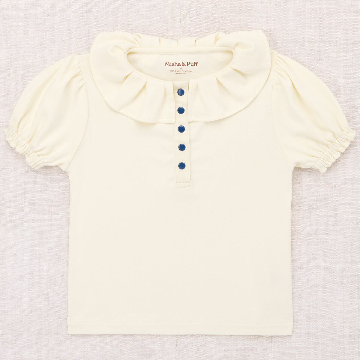 Ulla Tee by Misha & Puff. A short-sleeved top in Pima cotton, featuring puff sleeves with soft elasticated cuffs, a pleated collar, and partial snap button front closure. A great style for layering.