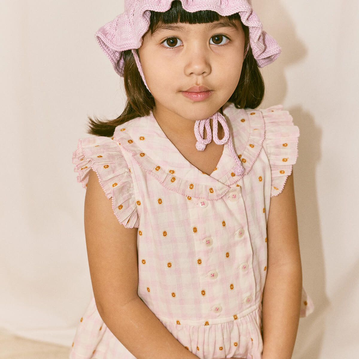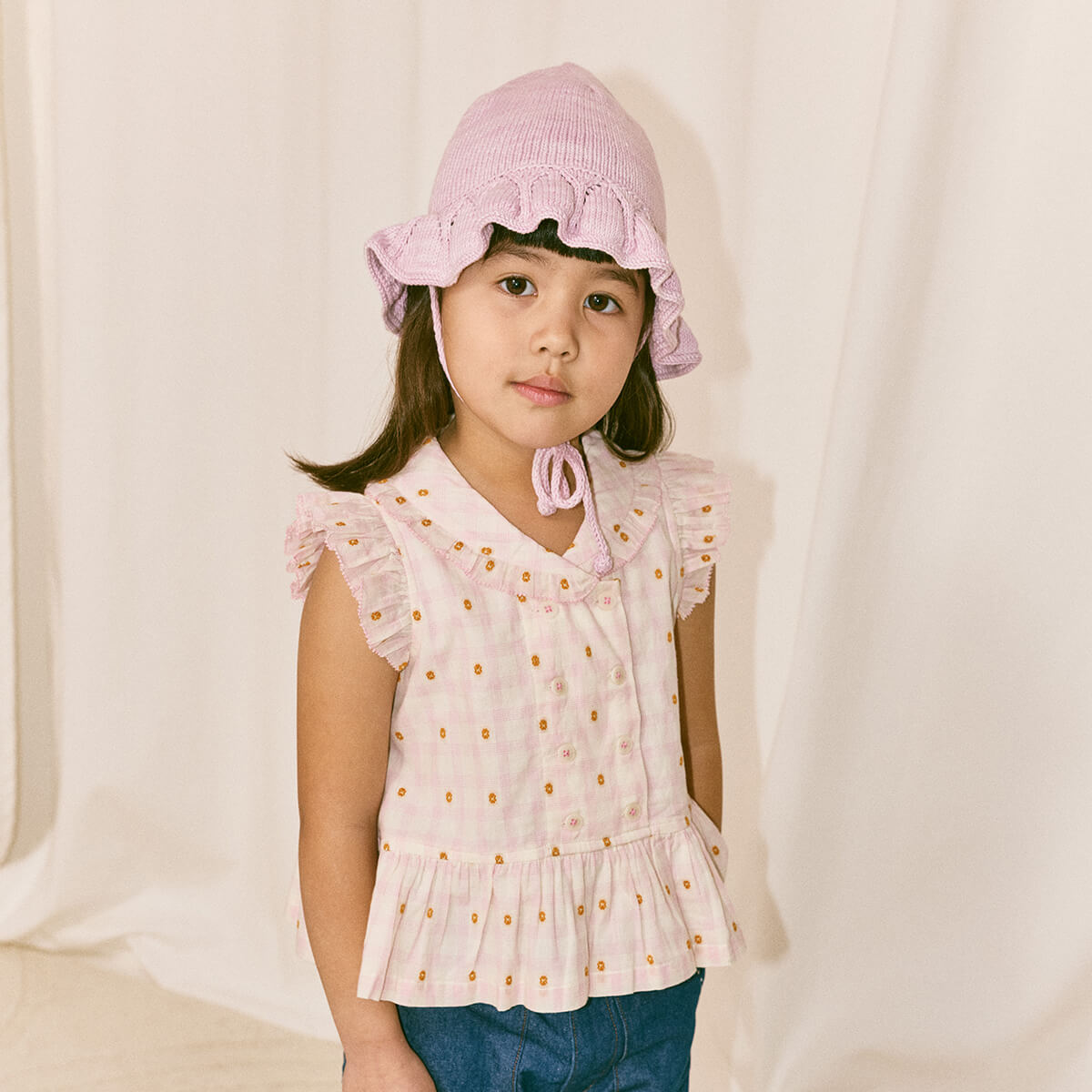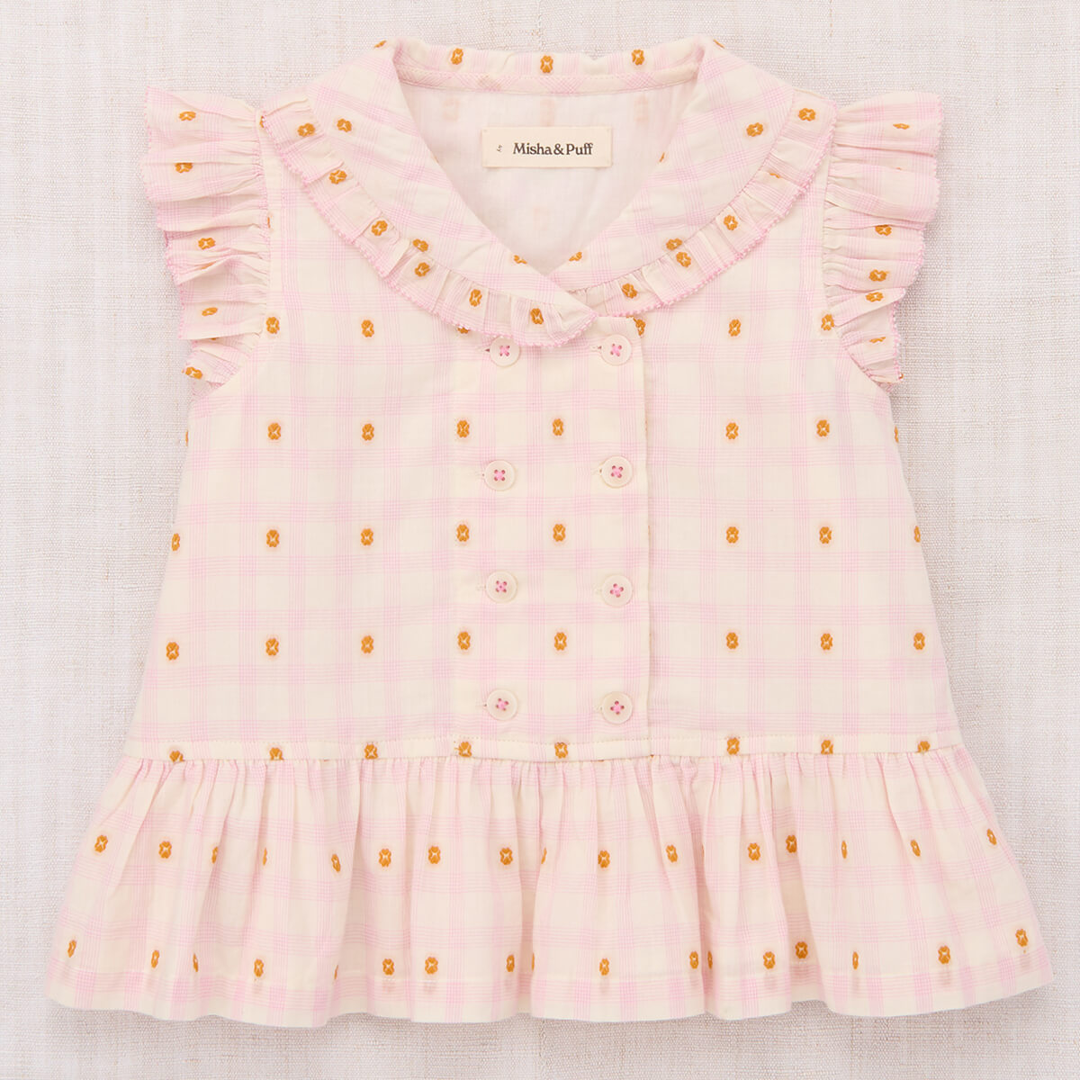 Voyage Shirt by Misha & Puff. A sleeveless peplum top in lightweight organic cotton plaid, with a woven textured design, rounded collar, ruffle trim with edge detail, and a double-breasted corozo button closure. Lined in cotton voile and finished with French seams.