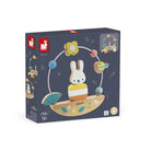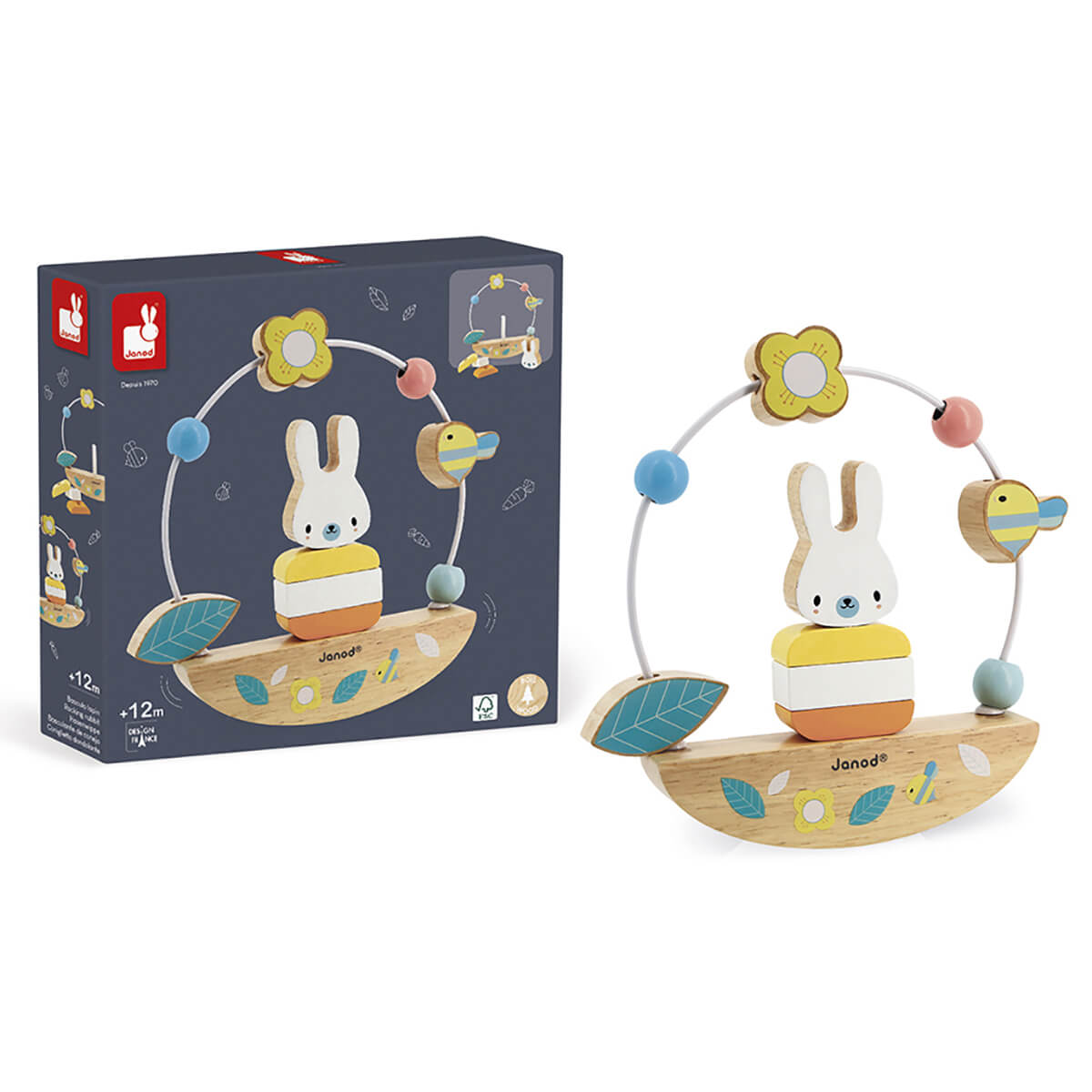 Bead Maze and Rocking Rabbit by Janod. A lovely toy full of interactions in baby's hands. This little rabbit from the Pure collection is so sweet. This 3-in-1 wooden learning toy will amuse curious little ones thanks to its adapted early years activities: a stackable rabbit in 4 parts to be assembled, a looping arch along which baby can move 6 wooden elements, and finally a fun rocking stand that will gently move it. This gorgeous baby toy features beautiful pastel colours and cute characters. Alongside these new companions, little ones will develop their fine motor skills and visual acuity while having fun.