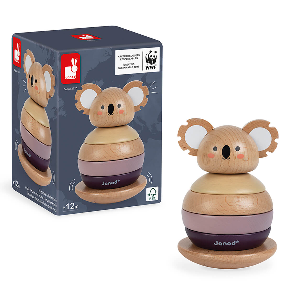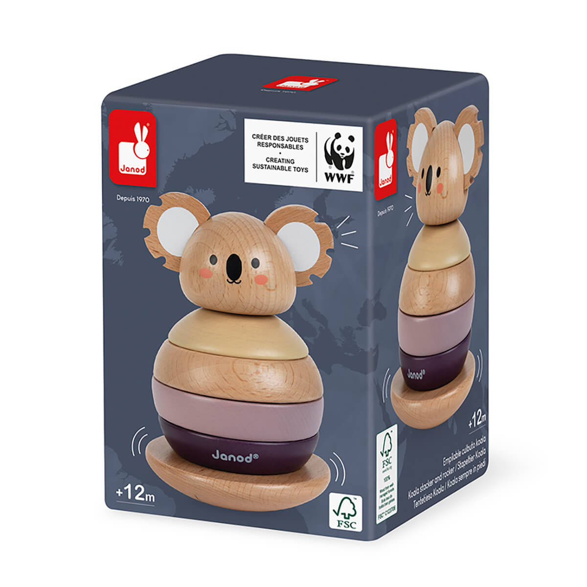 Koala Stacker and Rocker by Janod. This sweet stacking toy is made up of 5 pieces to put together on a rocking base. FSC®-certified solid wood toy (made using wood from sustainably managed forests) Water-based paint. Did you know? Koalas spend more time sleeping than any other animal on earth. They spend anything from 18 to 20 hours a day in the land of nod! Toy developed in collaboration with WWF®. Janod is supporting WWF®™’s efforts to protect the environment and biodiversity with a new range of toys made from more sustainable materials. We hope this range will inspire the next generation and encourage them to stand up for wildlife and the natural world in the future.