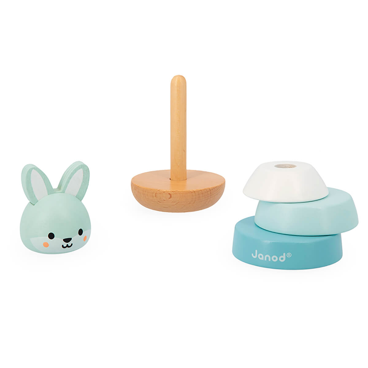 Stacking Rabbit by Janod. A must-have when it comes to baby's first games: a stackable toy comprising 4 pieces - in different sizes and colours - to be combined in the correct order on the solid wood pole. This puzzle is ideal for developing fine motor skills and helping children become familiar with sizes and colours. For added safety, the central rod is attached with an elastic to be movable.