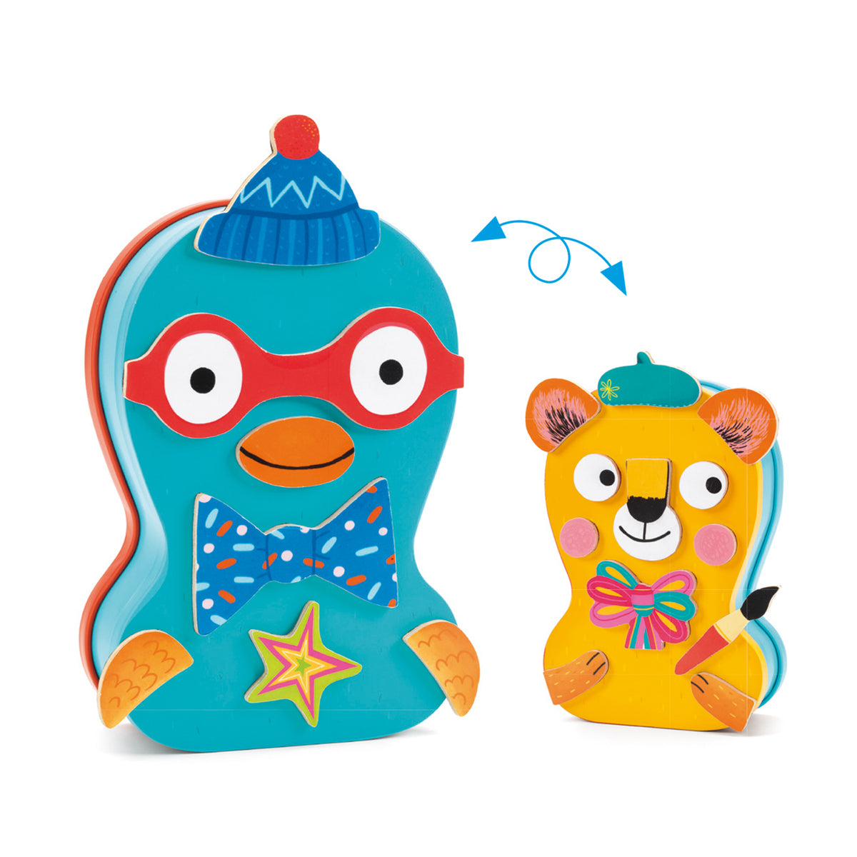 Portranimo Inzebox wooden magnet create kit by Djeco. Create your own funny animals with this 44 piece wooden magnetic set.  Create either a bear of penguin on both sides of the metallic box.