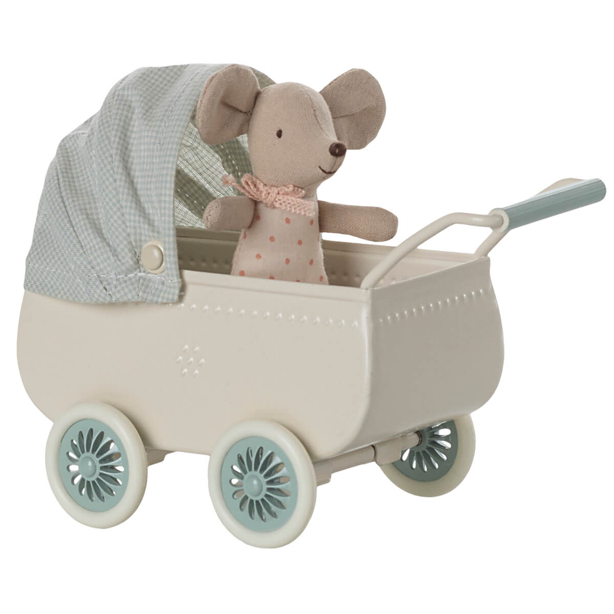 Pram With Baby Mouse by Maileg. The beautiful pram has a vintage look and comes with a small mouse in a sleeping bag. The mouse is laying on a soft mattress in the pram and will sleep for hours.