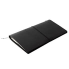 Traveler's Notebook in Black by Traveler's Company. The iconic refillable notebook in soft black leather. It is closed with an elastic strap and metal toggle to hold it together. Filled with plain Midori 80gsm paper which is bleed proof and a smooth writing surface for pens and pencils. When opened, the notebook lays flat with no visible seams or stitching. The soft leather cover ages beautifully as you use it and can be cleaned gently with a cloth.