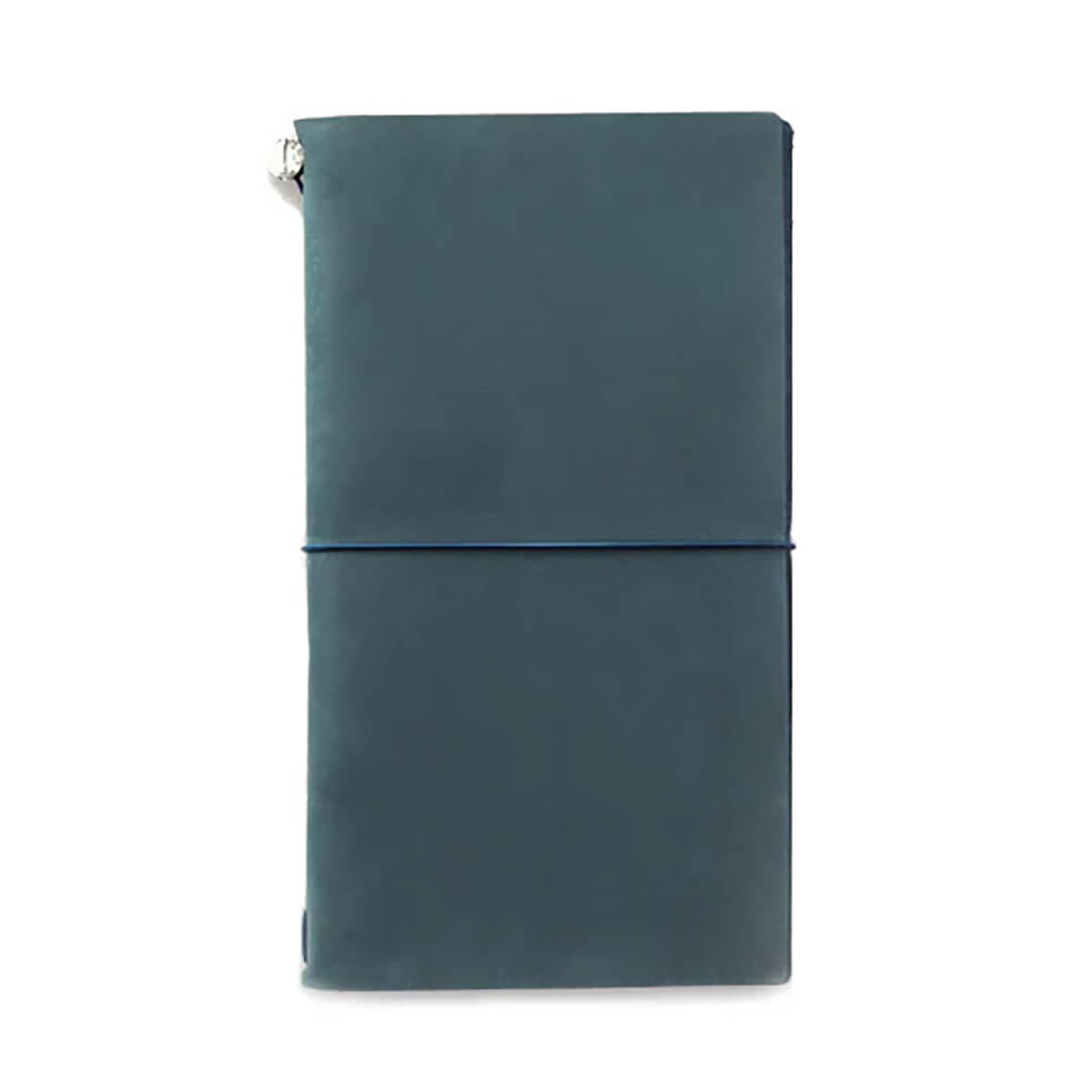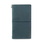 Traveler's Notebook in Blue by Traveler's Company. The iconic refillable notebook in soft green leather. It is closed with an elastic strap and metal toggle to hold it together. Filled with plain Midori 80gsm paper which is bleed proof and a smooth writing surface for pens and pencils. When opened, the notebook lays flat with no visible seams or stitching. The soft leather cover ages beautifully as you use it and can be cleaned gently with a cloth.