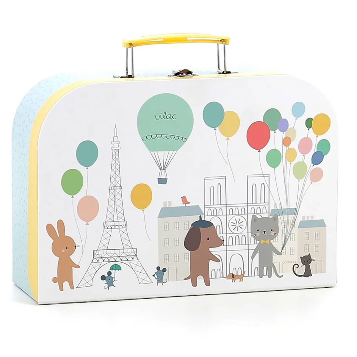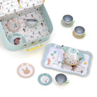 Musical tea set by Vilac.  A Magical musical tea set in a sweet suitcase. Plays Happy Birthday when the imaginary tea is poured. No batteries required, music box winds up underneath the base of the teapot. Set contains: 1 x musical teapot, 1 x serving tray, 4 x teacups, 4 x saucers, 4 x plates. Illustrated by Sarah Betz.