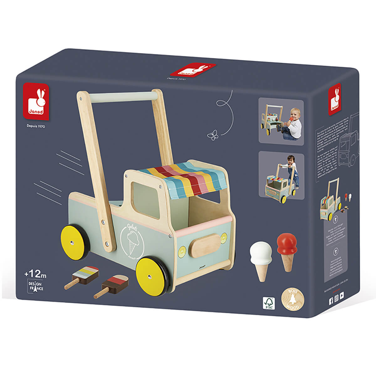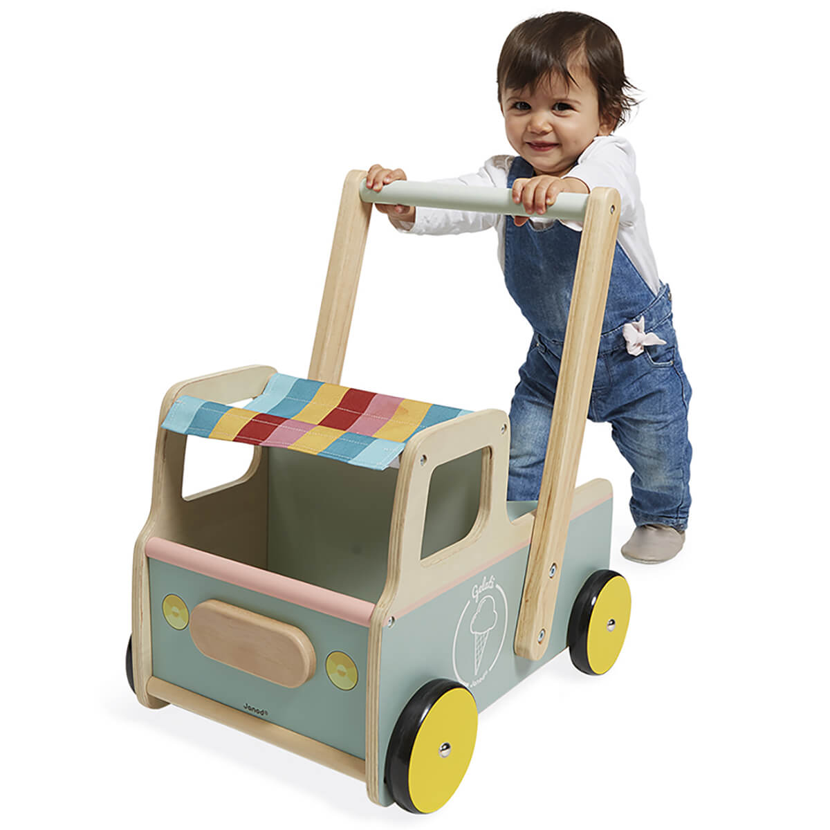 Ice Cream Cart Push Along Trolley by Janod. Would you prefer sorbet or ice cream? The ice cream seller is coming to town with this stylish trolley that will look great in any room. This push along cart helps baby with learning to walk while serving up 4 delicious wooden ice creams.