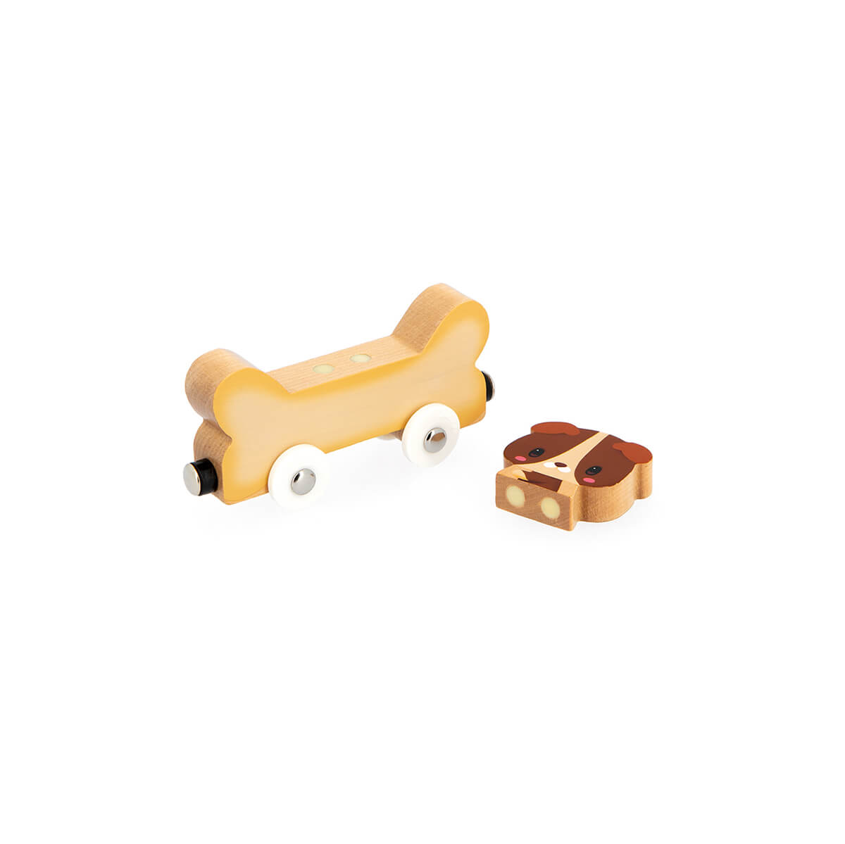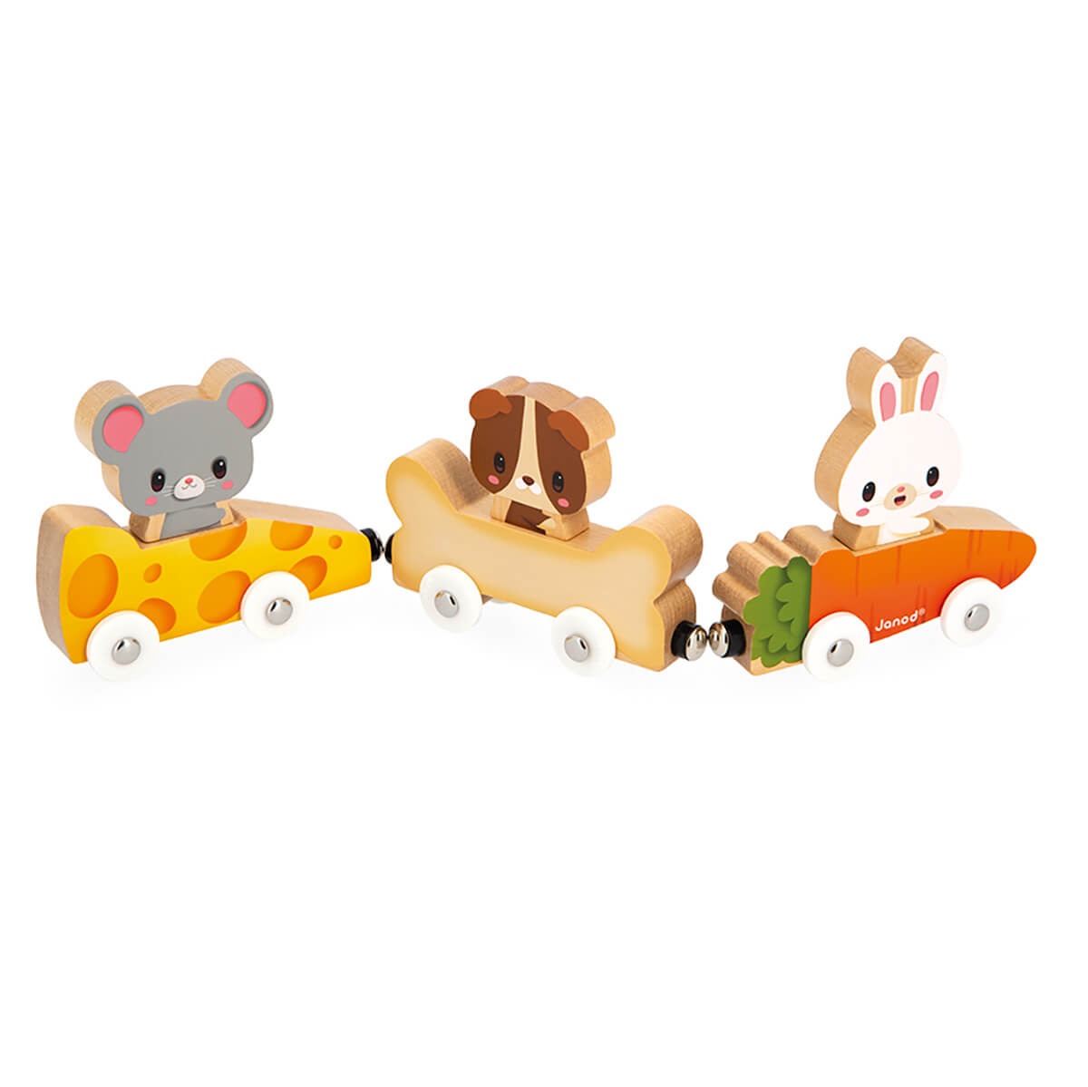Magnetic Pets by Janod. These 3 adorable pets, a mouse, a dog and a rabbit, ride along in their matching food cars attached by magnets. Pair the animals with their correct food and drive them along separately or as a train.