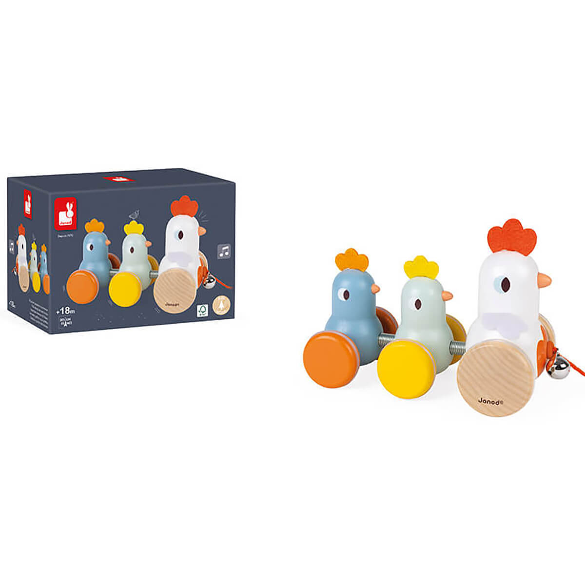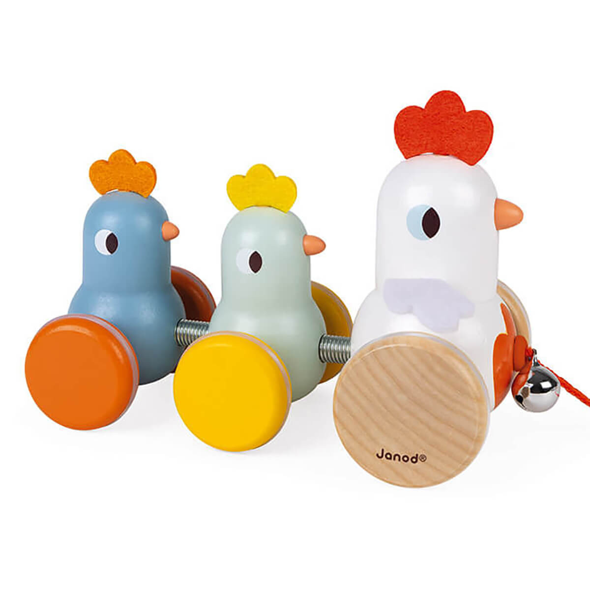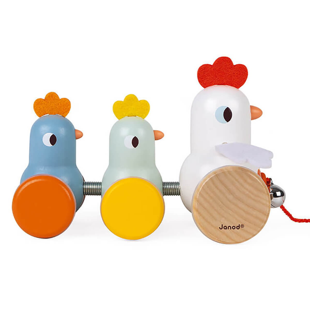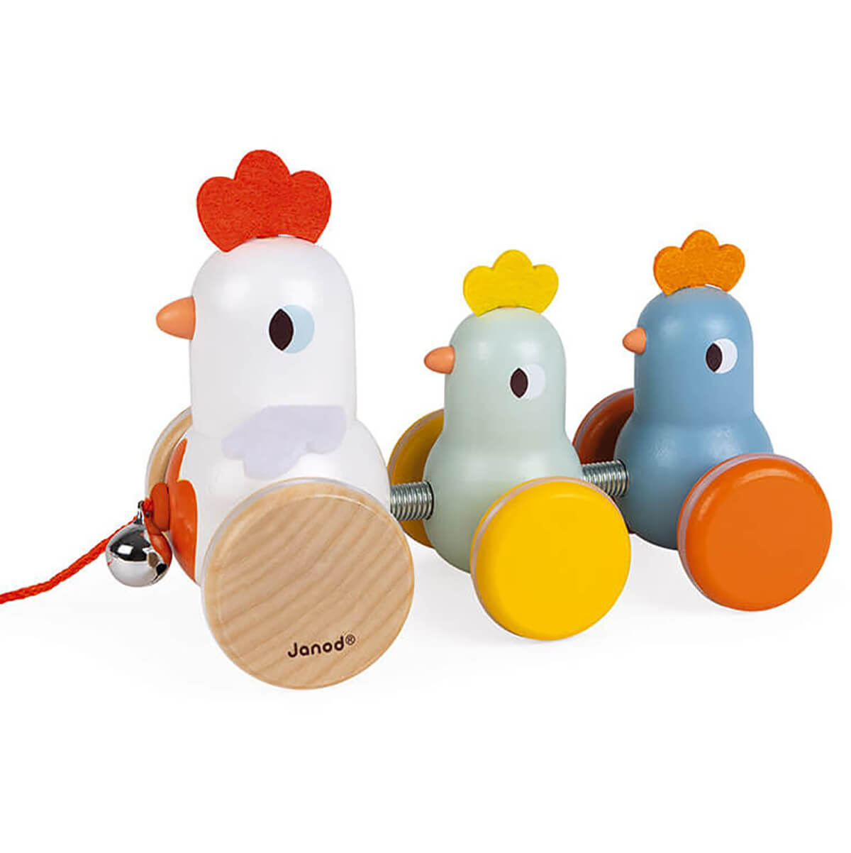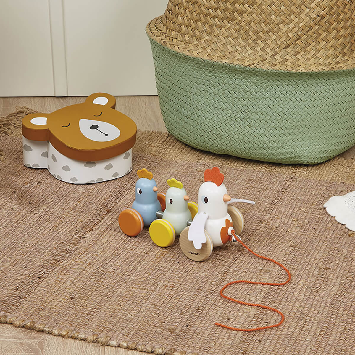 Pull along hen and chicks by Janod. Make way - hen family coming through! Just look at this mother hen teaching her chicks how to walk. They’re so cute! This early-years toy for children aged 18 months and over is incredibly cute, with its little wooden animals, soft colours and shapes and felt crests. Baby can get the whole family moving by pulling the string, and work on their motor skills at home or outdoors. This chick will make baby laugh thanks to its swaying gait and its bell, which tinkles happily as it walks along. The whole family are connected to each other by springs, so there’s no chance of losing anyone on the way!