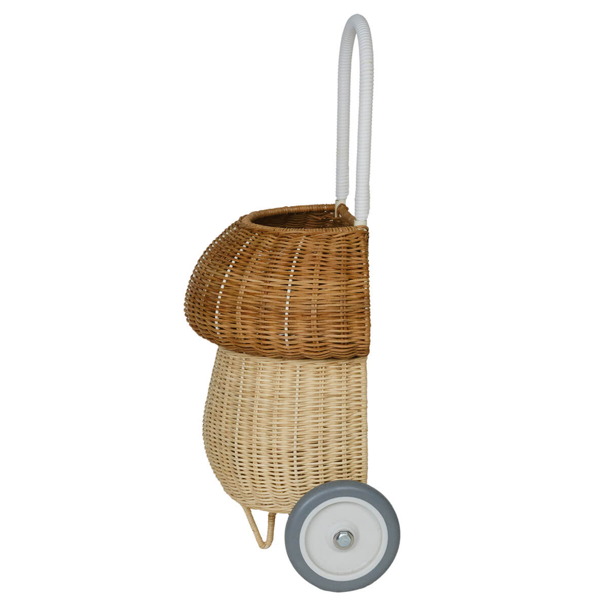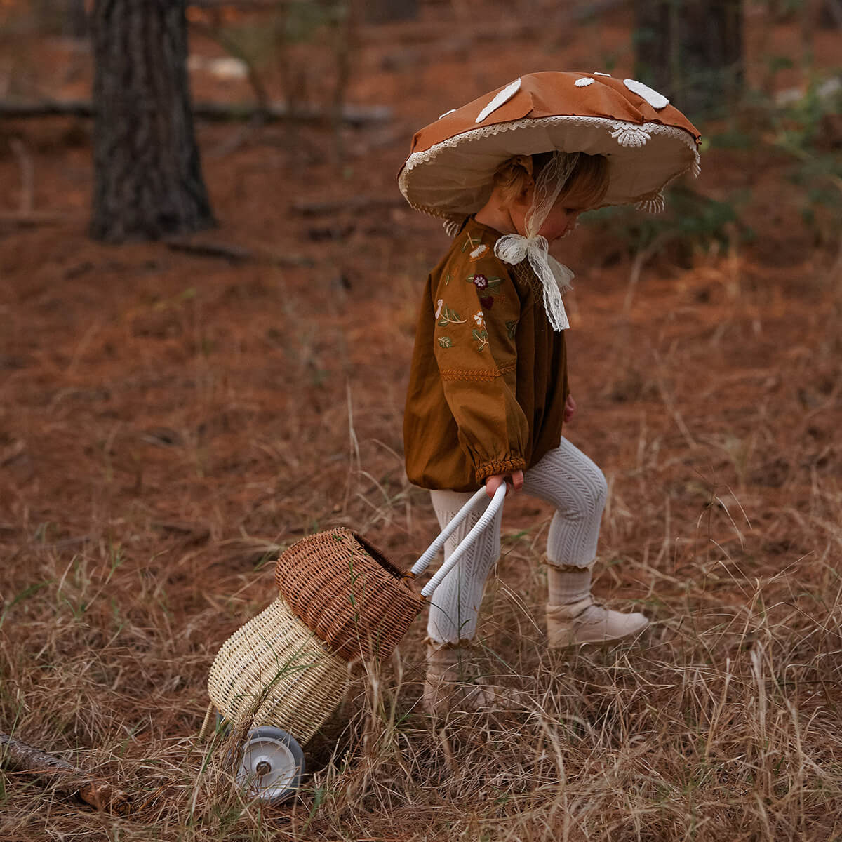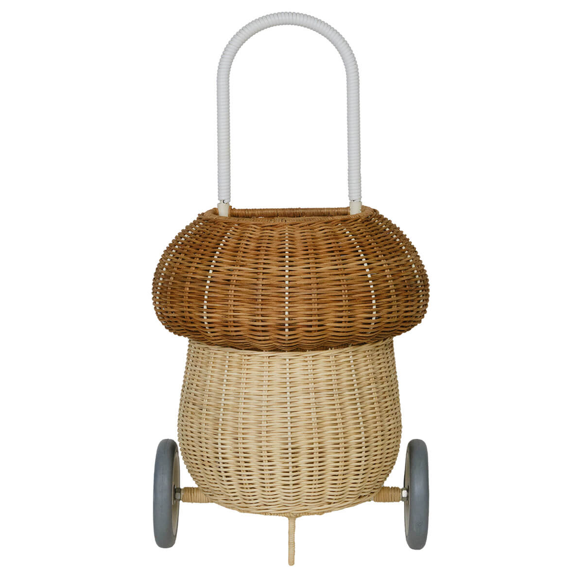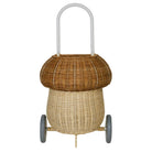 Rattan mushroom luggy basket by Olli Ella. Meet our whimsical Mushroom Luggy in two toned Natural. It exists in the world between practical and fairytale and is perfect for lugging about at home or on the go. Brimming with all the features that make our Classic Original Luggy such a hit, this 100% Handwoven Rattan wheeled basket is ideal for storing and toting around prized possessions! The best bit? The Mushroom Luggy is roomy enough to keep all things precious safely stowed away inside. Mushroom Luggy makes a beautiful addition to any woodland-themed nursery or bedroom and hits just the right notes of vintage x quirky. This Luggy is designed to roam wherever your child may go from the beach to the playground and everywhere in between. This Luggy makes for excellent toy storage when not in use and is terrific for carting and adventuring with Dinkum Doll and Holdie Folk friends too.